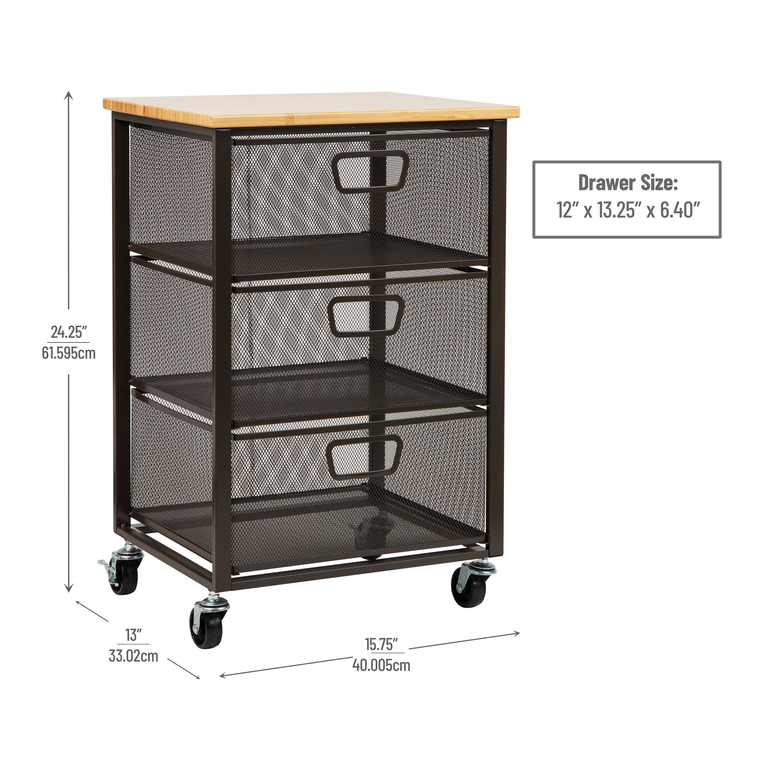 Minimalist design: The mix of mesh and solid metal framing makes this rolling file cabinet both attractive and sophisticated in your home or office Saves space: The slim design includes three removable drawers to organize your small desk items, books, and pads Easy to move: With four caster wheels, you can move this organizer to your desk, closet, or another room with ease Durable and easy to clean: This rolling file cabinet is made with durable materials and is easily cleaned with mild soap and a soft cloth Dimensions: This rolling file cabinet measures 15.75 long x 13 wide x 24.25 inches tall (40.01 x 33.02 x 61.60 centimeters) and weighs 11.2 lbs (5.08 kgs), this portable storage cart is the perfect size for maximizing space