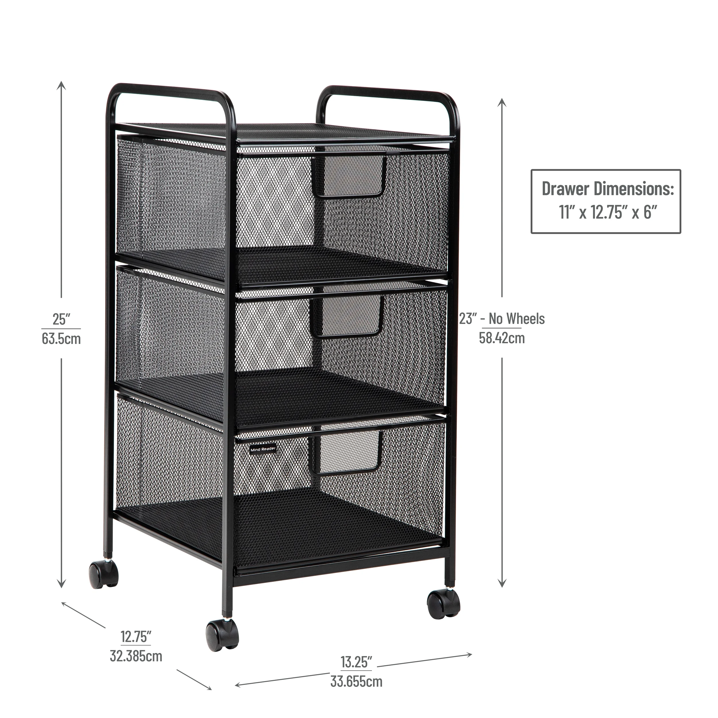 Minimalist design: The modern mix of mesh and solid metal framing is attractive. This cabinet comes assembled with the wheels packed separately, to attach simply push in place or you may choose to use the cabinet without the wheels Saves space: The slim design includes three removable drawers to organize your small desk items, books, and pads. Each drawer measures 11″ long by 12.75″ wide by 6″ deep (27.94 x 32.39 x 15.24cm) Easy to move: With four caster wheels, you can move this organizer to your desk, closet, or another room with ease Durable and easy to clean: This rolling file cabinet is made with durable materials and is easily cleaned with mild soap and a soft cloth Dimensions: This cabinet measures 12.75 inches long by 13.25 inches wide by 25 inches tall (32.39 x 33.65 x 63.5 cm) and weighs just 7.16 lbs (3.25 kgs), this cart is the perfect size for maximizing space without sacrificing functionality