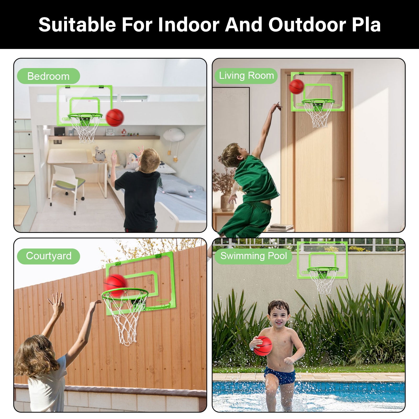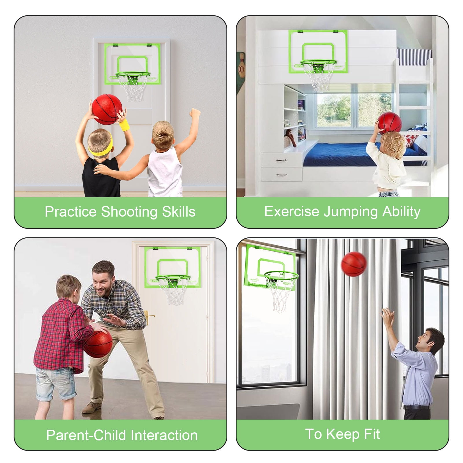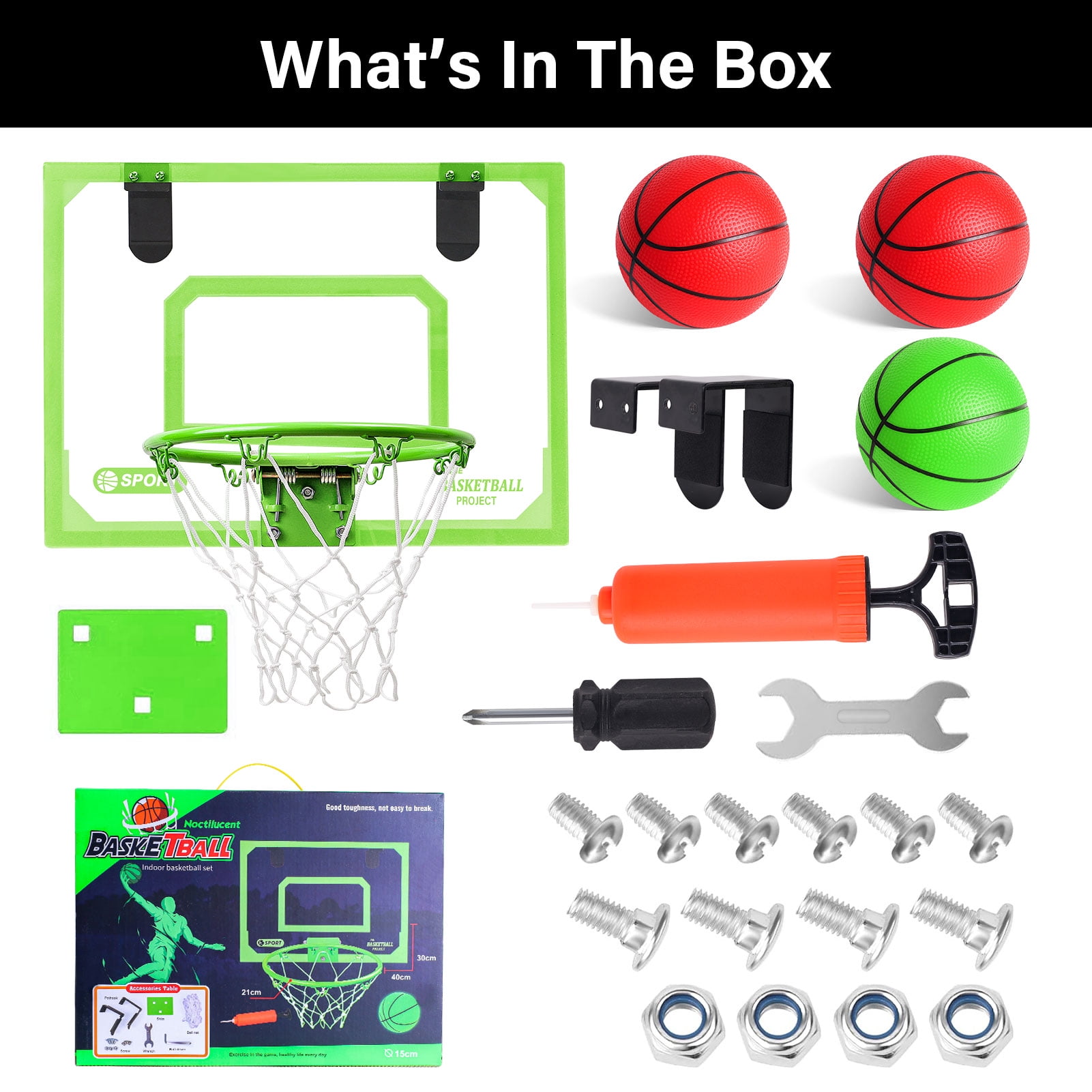 Experience the BUDALGA joy of basketball anytime, anywhere with 15.7*11.8 inch indoor basketball hoop. Crafted for enthusiasts of all ages, this game promises endless entertainment, making it an ideal gift for both kids and adults. Built with the highest quality standards, the backboard is made from a clear, shatter-resistant polycarbonate, ensuring it withstands the test of time and intense gameplay. Not only that, but it also introduces an innovative glow-in-the-dark feature, so the game continues even when the lights go off! Designed with care and precision, dense foam padding shields your door from any potential damage and mutes any noise during play. Setting it up is a breeze thanks to the clear instructions and provided tools. Plus, its detachable design ensures convenient storage. Dive into a world of fun, day or night, with our luminous basketball hoop!