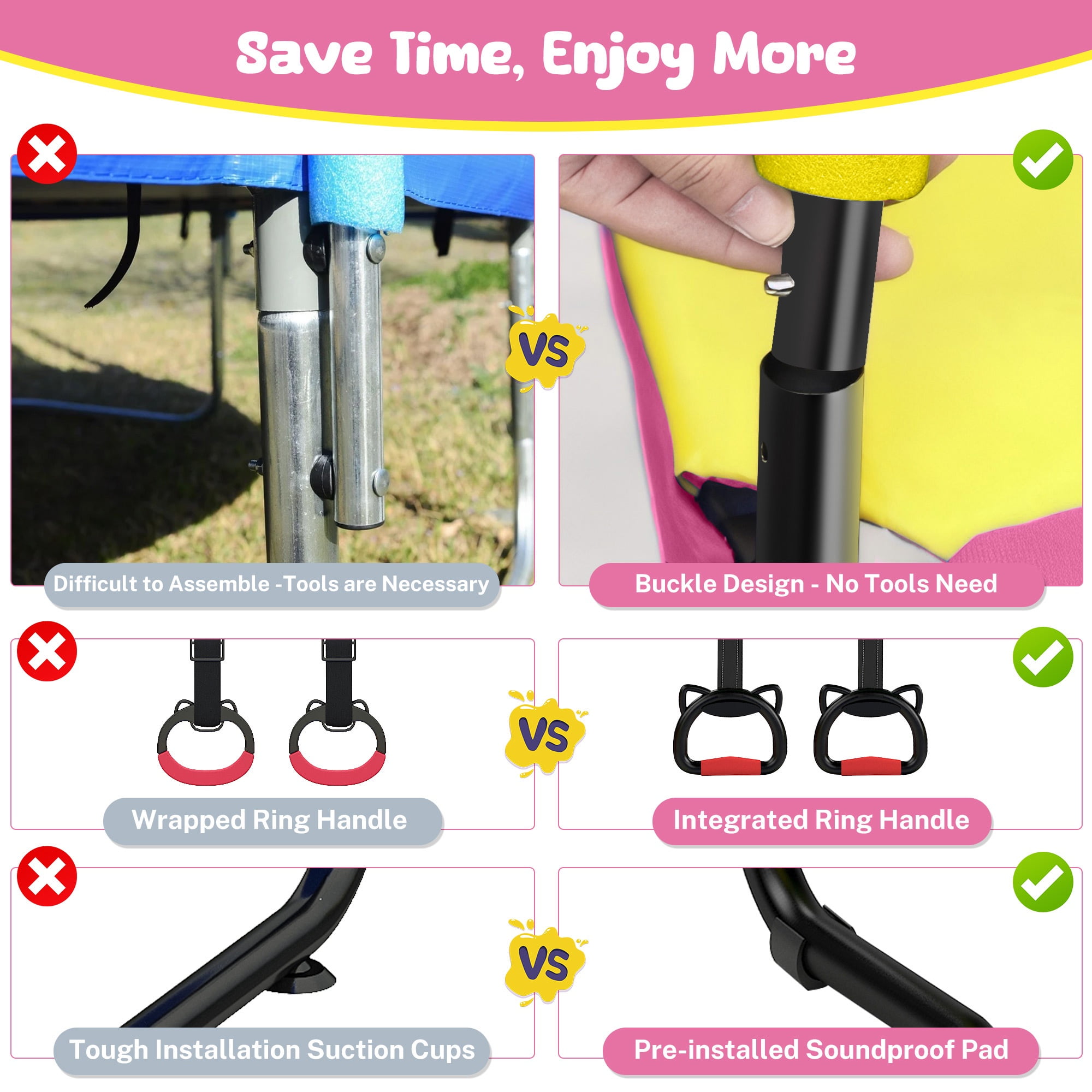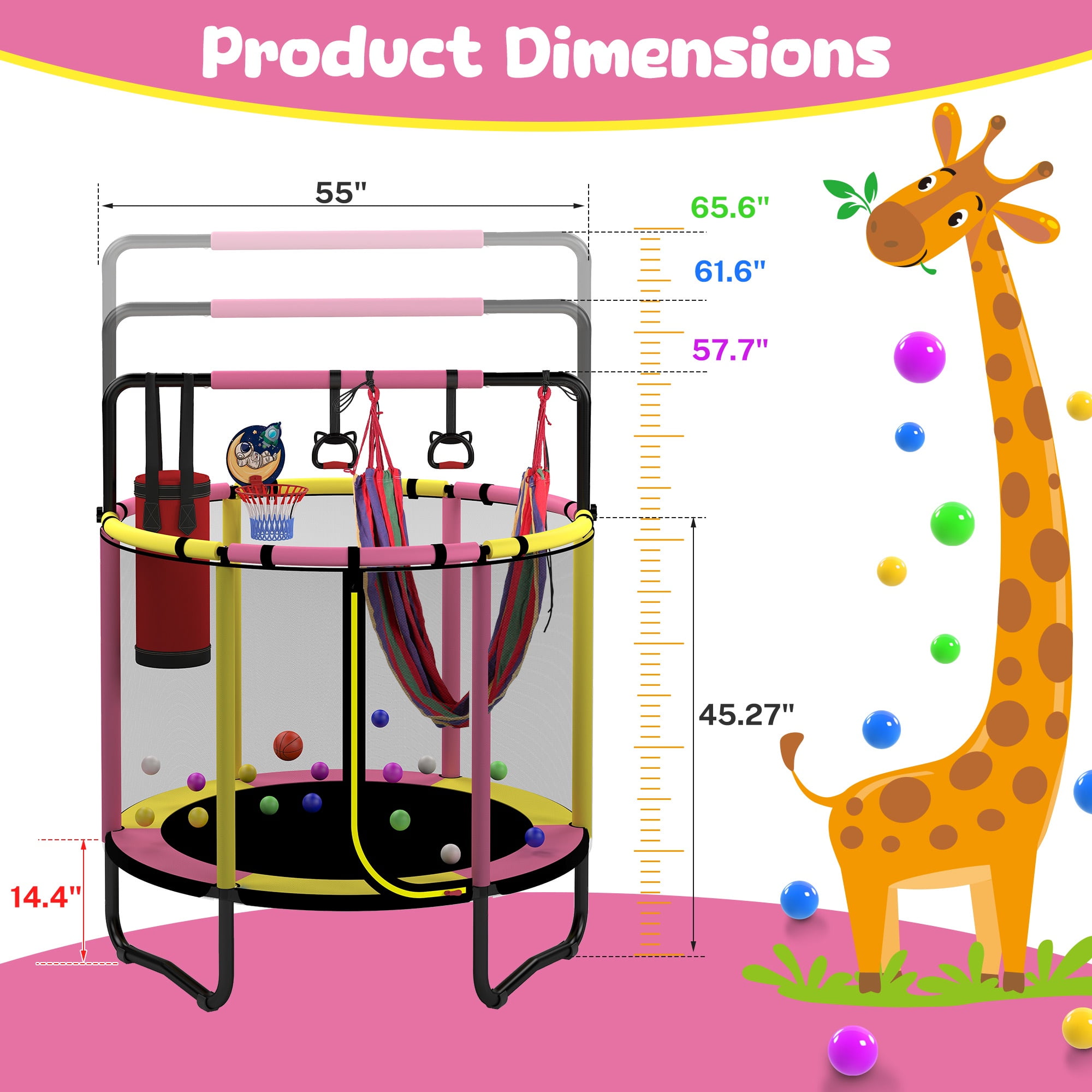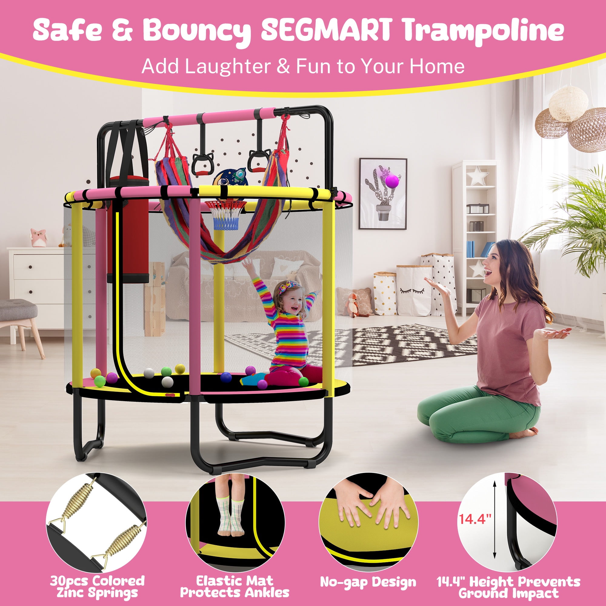 Jump into Fun with Segmart Upgraded 55” Trampoline! Enjoy limitless fun with 7 exciting accessories, including a mini basketball hoop, swing, sandbag, gymnastic bar, lifting ring, mini basketball, and ocean balls! Upgraded for superior quality at the same price, it features a tool-free setup and 3 adjustable heights for all ages. Safe and sturdy, it’s perfect for indoor and outdoor play. 📸 Enhanced Quality, Same Price The Segmart 55″ trampoline accessories have been upgraded for better quality without any price increase. Enjoy a heavy-duty hammock, quiet fabric straps for sandbags, and pre-installed soundproof pads. 🥳 More Accessories Bring More Fun The Segmart upgraded 55” trampoline comes with 7 exciting accessories: 1 basketball hoop & rubber ball, and a pump, 1 swing, 1 swing bag, 1 sandbag, 1 gymnastic bar, 2 lifting rings, 15 ocean balls. 👀 Easy Installation The Segmart upgraded 55” trampoline makes setup a breeze. No tools are needed with our buckle design. The improved ring handle and pre-installed soundproof pads ensure hassle-free installation. 🍉 New Version Adjustable Gymnastics Bar Compared with the old version of 2 adjustment heights, the new gymnastics bar adjusts to 65.6″, 61.6″, and 57.7″, catering to different heights and ages. Perfect for personalized experiences and gradual workout difficulty increases. 🥰 Safe and Fun The Segmart upgraded 55” trampoline ensures safe jumping with transparent mesh netting for easy monitoring and a thick foam-covered framework to prevent injuries. No-gap design and 14.4″ height prevent ground impact and offer ankle protection. 🎨 Interactive Activity The 15 vibrant ocean balls instead of 10 balls add joy to parent-child bonding and reduce screen time. Features a sturdy galvanized steel structure, foam-padded poles, and a safety net for safe jumping. 🏳️⚧️ Considerate Structure A high-quality spring pad, premium jump mat, and 30 heavy-duty springs provide a powerful bounce. Thick foam padding covers safety poles for soft cushioning and collision impact reduction. 🌻 Good for Kids’ Growth Suitable for ages 1 and over. Great for after-school fun and exercise, developing strength, balance, stamina, and coordination. 💯 Sturdy Construction The Segmart upgraded 55” trampoline’s sturdy safety net is made from high-density, tightly woven materials and has 3 W-shaped legs. The L-shaped zipper design offers convenient and safe access. 🥳 Indoor/Outdoor Use With a 55” diameter, the Segmart upgraded 55” trampoline fits indoors or outdoors. The high-strength polyester net with UV additive withstands time and weather. ✉️ Best Gift for Kids Available in three colors with 15 colorful ocean balls. Perfect gift for girls and boys. The 3 adjustable heights make it ideal for growing kids. 🏳️🌈 Worry-Free Service We provide 24/7 customer service. Our customer-centric culture prioritizes your satisfaction and continuously listens to your feedback. Features: – Upgraded and high-quality – 7 fun accessories – 30 PCS Springs – 6 Soundproof padding – 6 Thickened Soft Foam Poles – Adjustable bar Heights: 65.6″, 61.6″, and 57.7″ – Indoor and outdoor use – Trampoline with Enclosure Net – Premium Jumping Mat Material is Strong and Sturdy – Durable Waterproof Spring Cover Pad – Steel Frame for durability and rust-resistant – Safe, supervised, injury-free jumping – Tool-free, easy installation – Suitable for ages 1+ Package Includes: 55” Trampoline x 1 ☘️Warm Tips: 1. There may be a chromatic aberration for light and monitor differences. 2. The size is measured manually, so there may be reasonable errors. 3. Casual return is not suggested unless caused by quality problems.