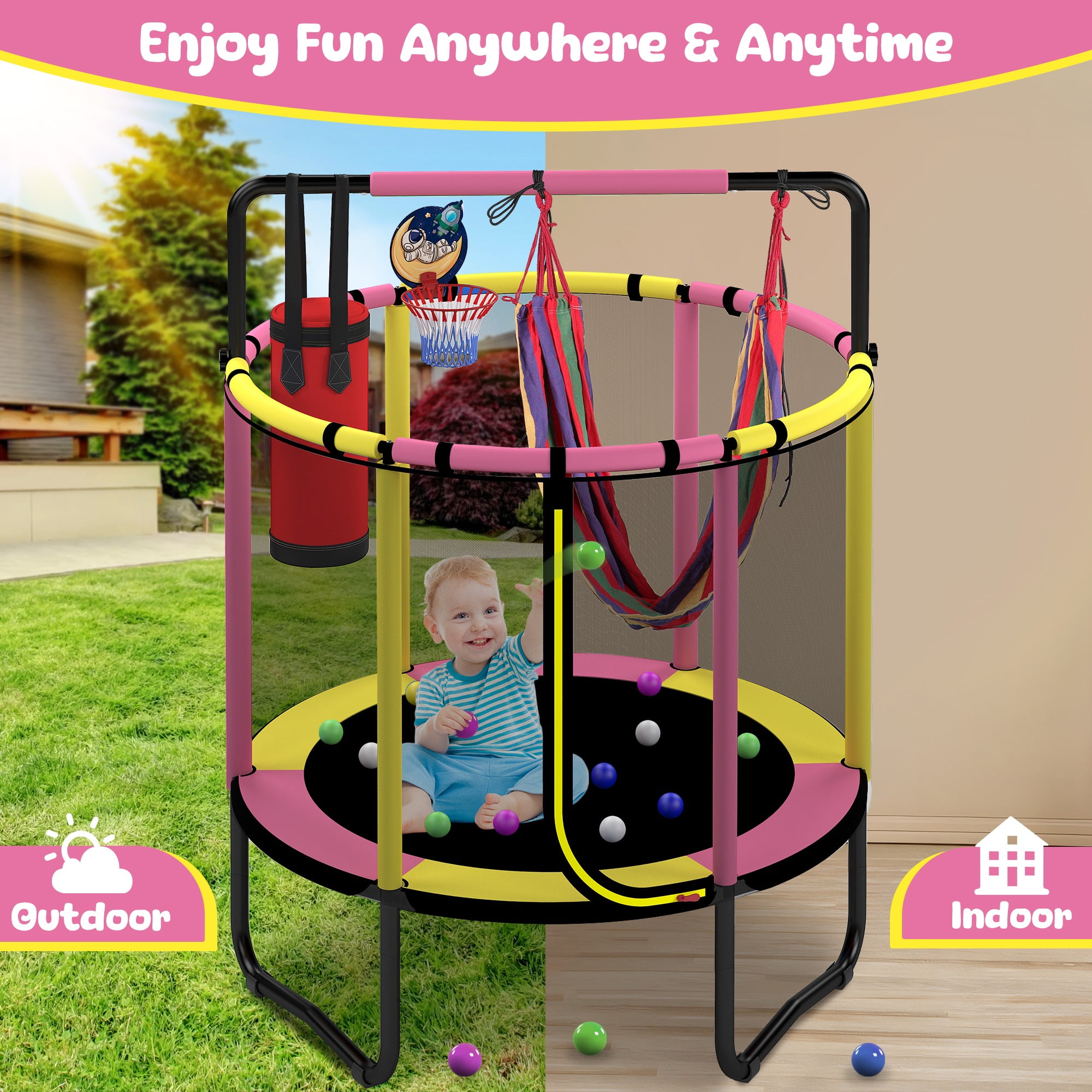 Mini Trampoline for Kids with Basketball Hoop, SEGMART 55” Indoor Outdoor Toddler Trampoline with Enclosure Net, Swing, Sandbag, Ring, Ocean Balls, Round Small Trampoline Gift for Boys Girls, Pink