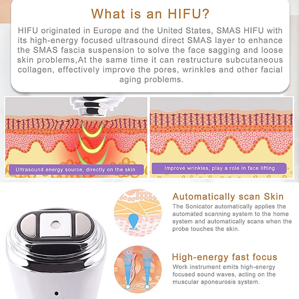 HIFU machine can penetrate to the dermis and fascia layer, suitable for face, forehead, corners of eyes, chin, and neck Can effectively help skin anti-aging, reduce wrinkles, remove fine lines and bags under the eyes, and improve eye conditions Heated up HIFU machine can promote the regeneration of collagen within a period of time to prevent skin sagging, thin the face, restore skin elasticity, and let you regain youthful skin HIFU machine can open skin pores, helping the skin to better absorb skin care products, allowing essential oils to directly reach the deep layers of the skin and exert their greatest effect Mini HIFU face lifting machine is made of high-quality materials Safe non-invasive stimulation of collagen and elastic fibers in the deep High precision focal ultrasound positioning, precise operation does not hurt the surrounding tissue An operation without repeated operation, can achieve good effect No recovery period after the operation, can be beautiful appearance, do not affect the work life The process of comfort energy to the dermis, avoid the knife, no wound