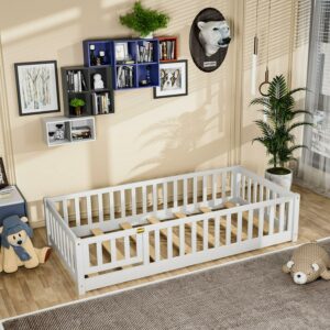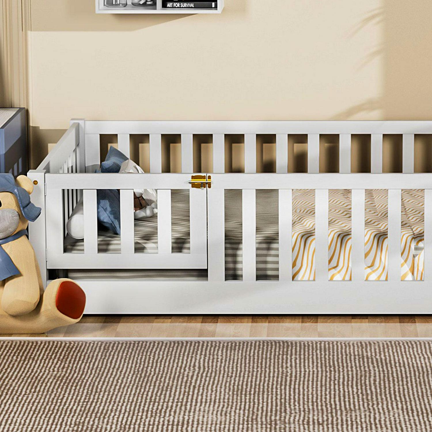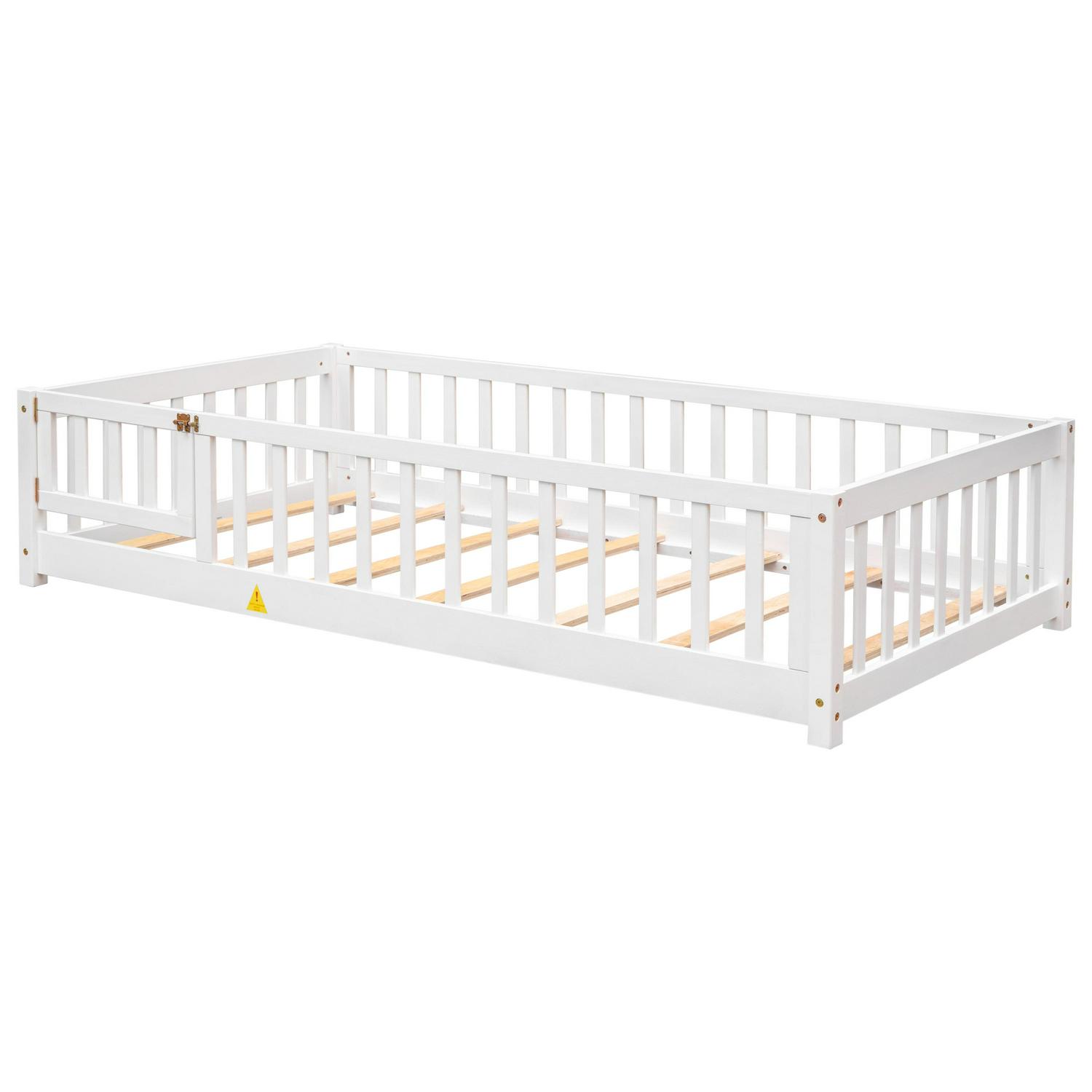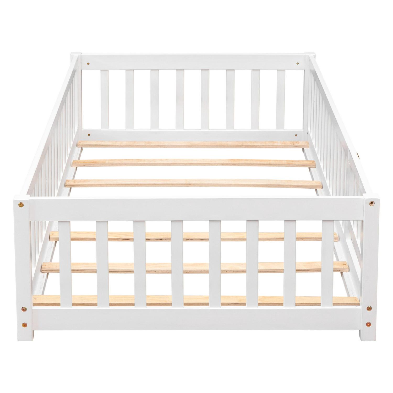 Miniyam Twin Size Toddler Floor Bed with Fence, White
