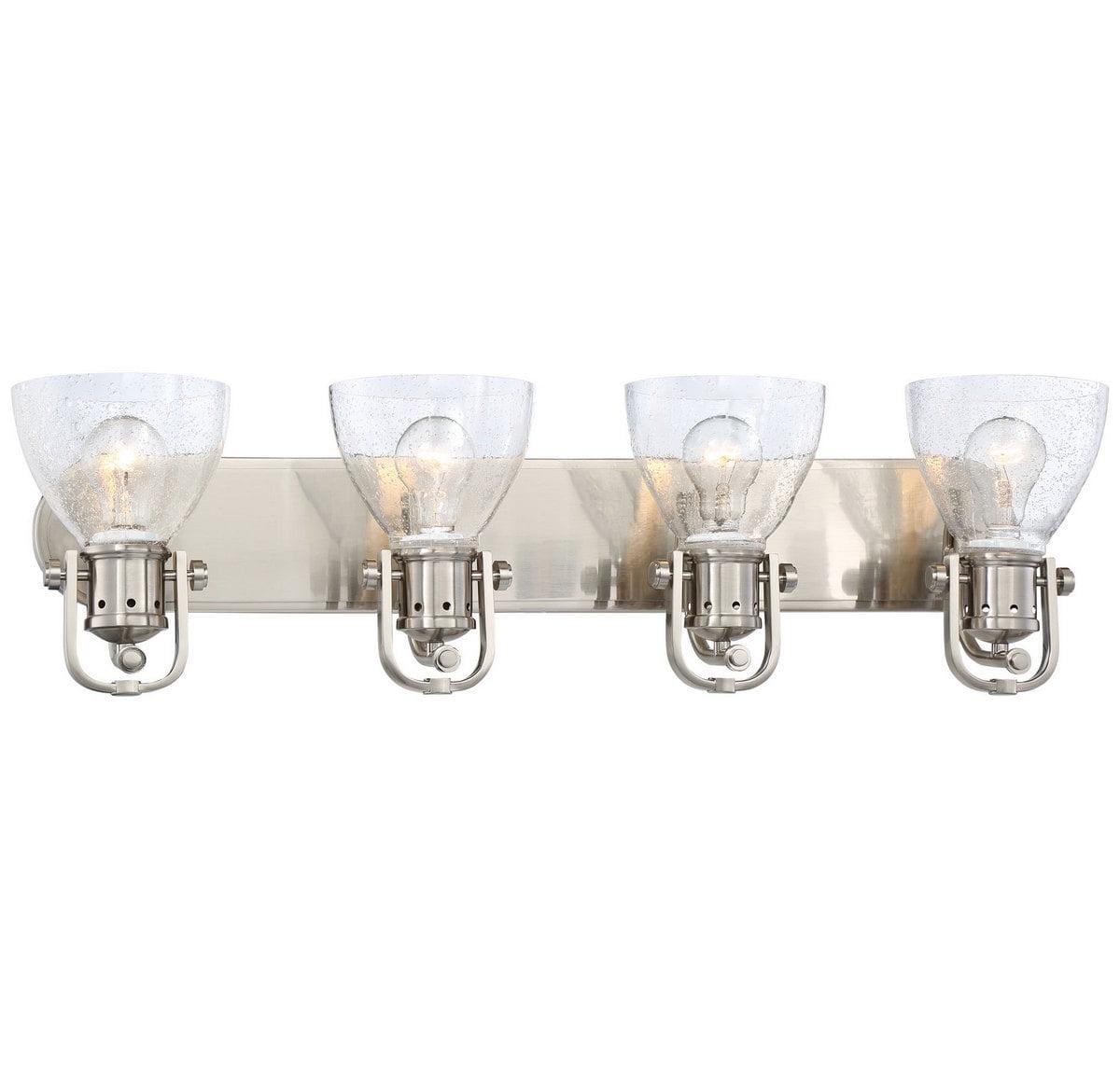 Minka Lavery-3414-84-Material: Steel, Finish Color: Brushed Nickel, Width: 31.5″, Height: 8.5″, Depth: 7.25″, Backplate Width: 30″, Backplate Length: 5″, Lamping Type: Incandescent, Number Of Bulbs: 4, Wattage: 100 Watts, Dimmable: Yes, Moisture Rating: Dry Rated, Desc: Mounting Direction: Reversible / Shade Included: TRUE. ,-4 Light Transitional Bath Vanity in Transitional Style – 8.5 inches tall by 31.5 inches wide