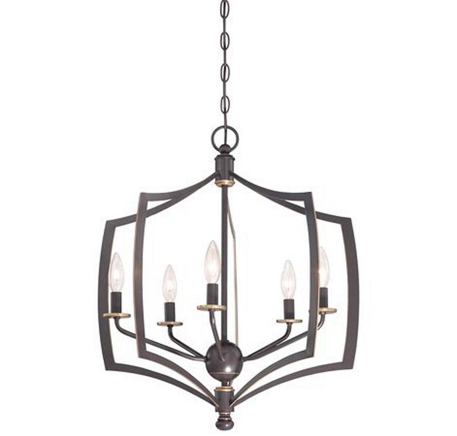 The distinctive Minka Lavery Middletown 5 Light Chandelier – Downton Bronze with Gold Highlights features sharp angles and clean lines. Gold highlights make details stand out against the Downton bronze finish of this chandelier. A central sphere supports sleek candelabra sockets. This chandelier requires five 60-watt bulbs (not included).