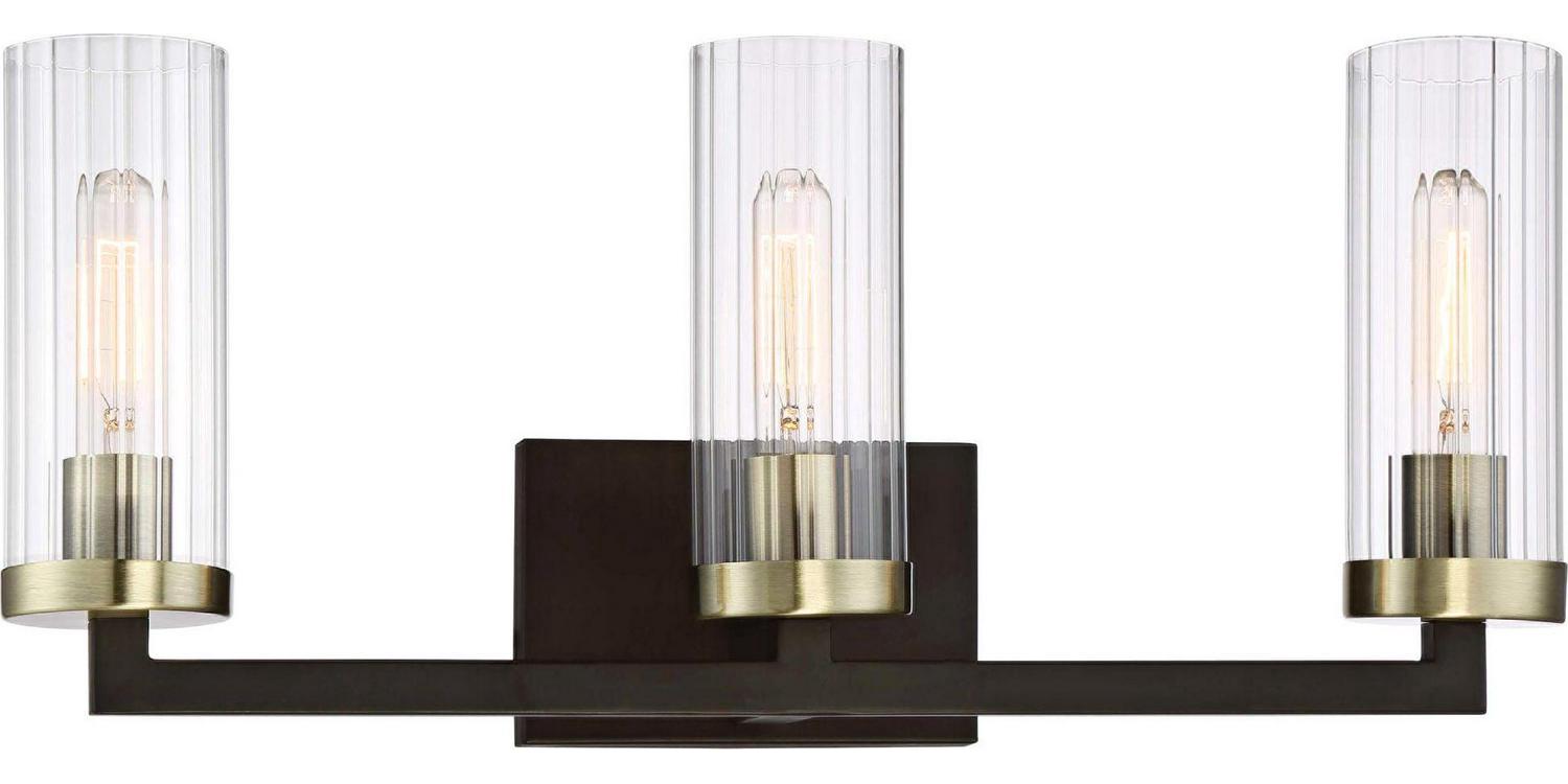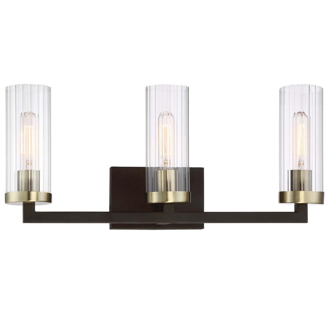 Minka Lavery-3043-560-Collection: Ainsley Court, Material: Steel, Finish Color: Aged Bronze/Brushed Brass, Width: 23″, Height: 10″, Depth: 5.25″, Backplate Width: 7″, Backplate Length: 4.5″, Lamping Type: Incandescent, Number Of Bulbs: 3, Wattage: 60 Watts, Dimmable: Yes, Moisture Rating: Dry Rated, Desc: Ainsley Court collection by Minka Lavery will add a classy design element to your transitional styled home. Textured earthen brown and brushed brass finish calls attention to its design detail, while the ribbed glass shades element is a nod to a simpler t,-Ainsley Court – 3 Light Transitional Bath Vanity in Transitional Style – 9.25 inches tall by 23 inches wide