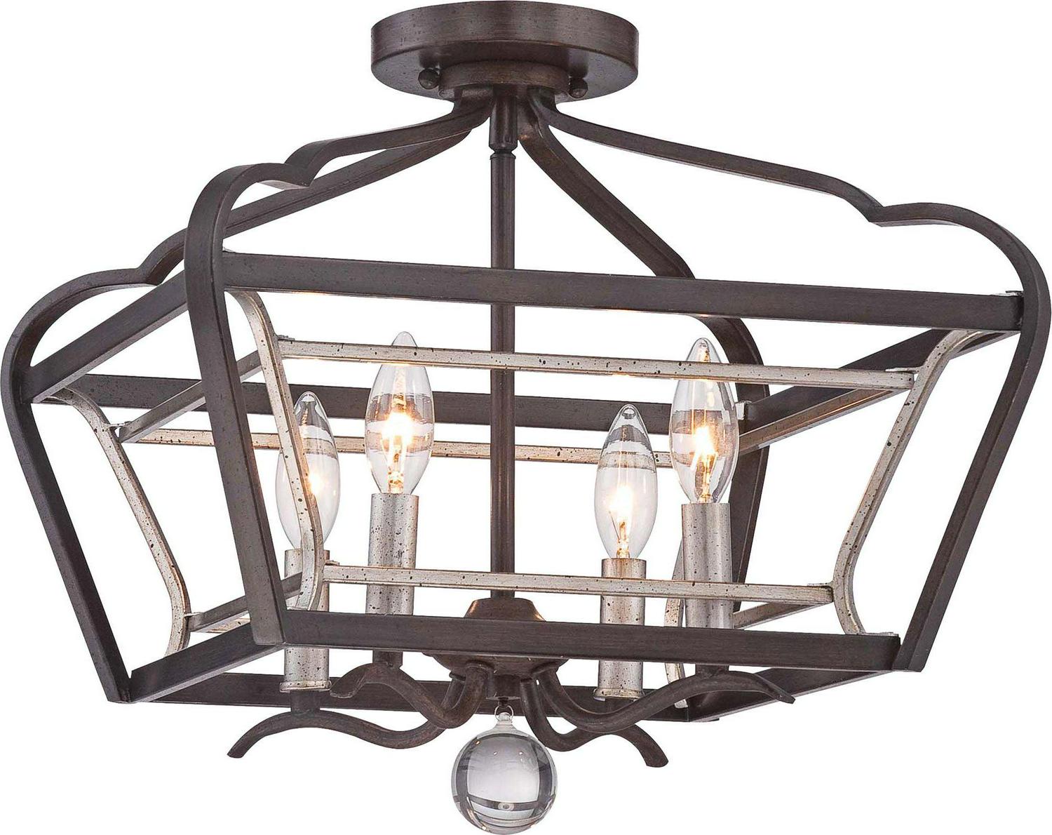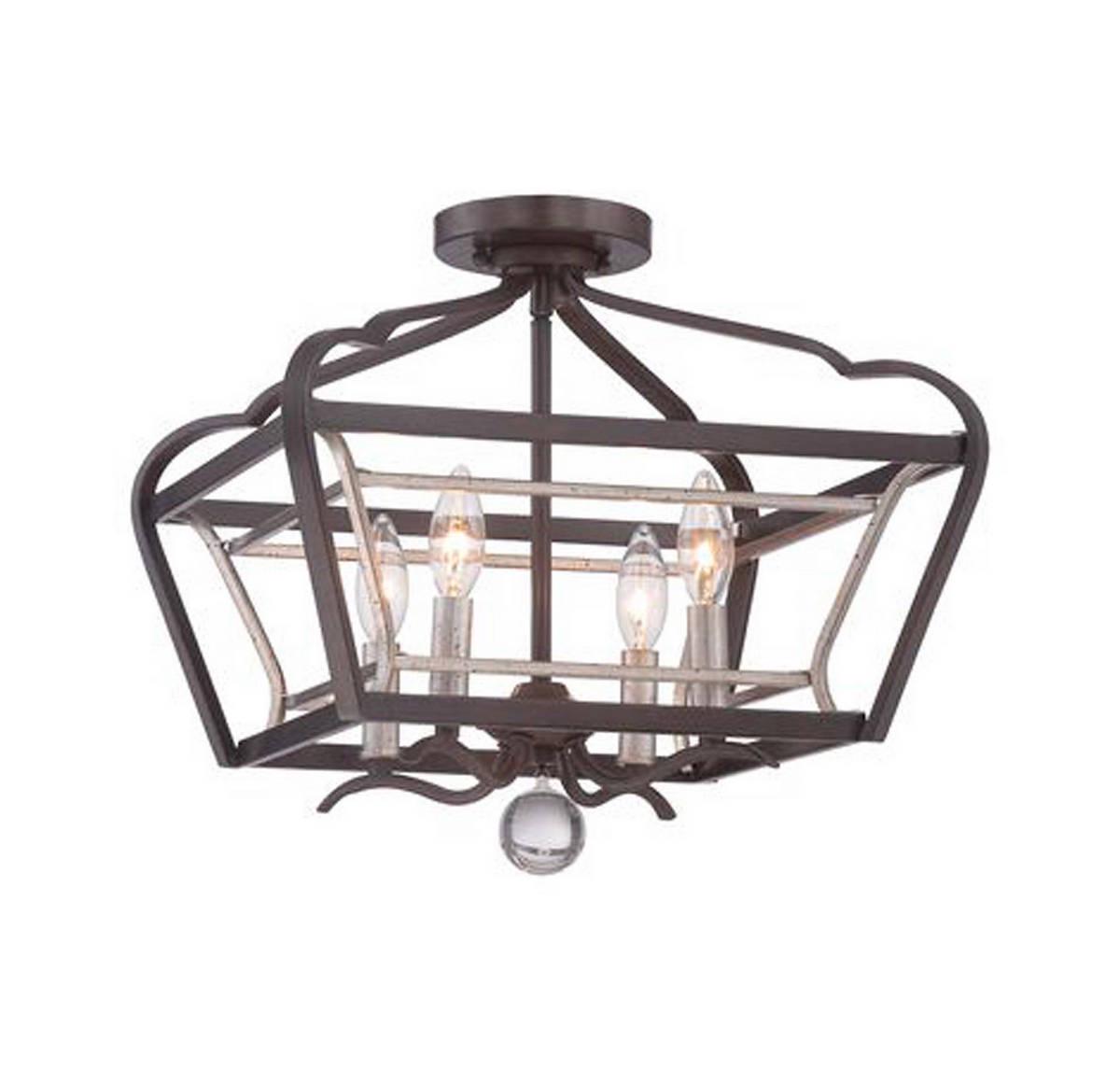 This rich, dark rubbed sienna finish, semi-flush transitional ceiling light is crafted with an open metal frame that blends the charm of an antique birdcage with the inviting allure of a classic lantern. Its four lights are presented candelabra-style surrounded by a delightful linear metal trim box in bright aged silver finish while a clear glass ball sparkles just below the frame. An inspiring addition to your beautiful home decor from Minka Lavery.