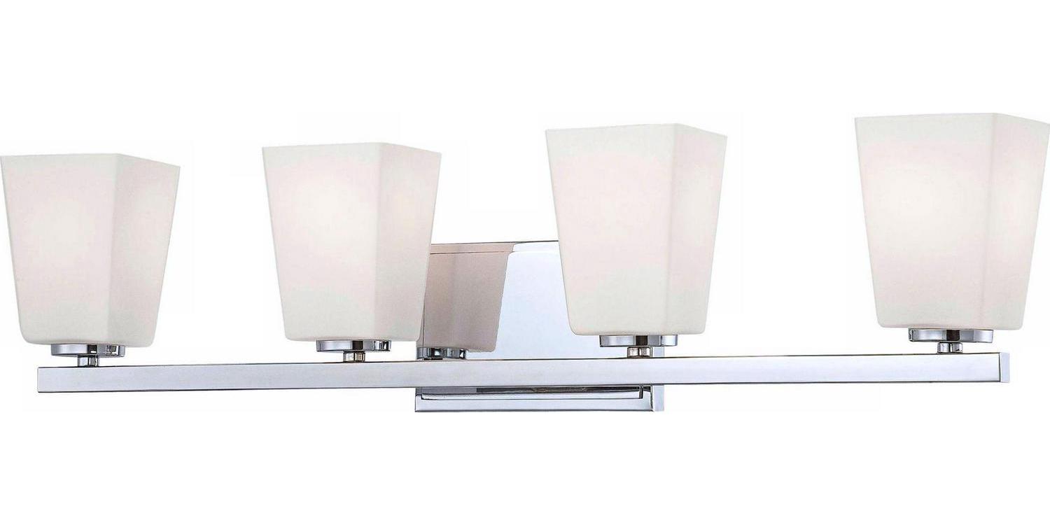 Minka Lavery-6544-77-Collection: City Square, Material: Steel, Finish Color: Chrome, Width: 29.25″, Height: 7″, Depth: 5″, Backplate Width: 0.63″, Backplate Length: 4.5″, Lamping Type: Incandescent, Number Of Bulbs: 4, Wattage: 100 Watts, Dimmable: Yes, Moisture Rating: Dry Rated, Desc: Mounting Direction: Reversible / Shade Included: TRUE. ,-City Square – 4 Light Transitional Bath Vanity in Transitional Style – 7 inches tall by 29.25 inches wide
