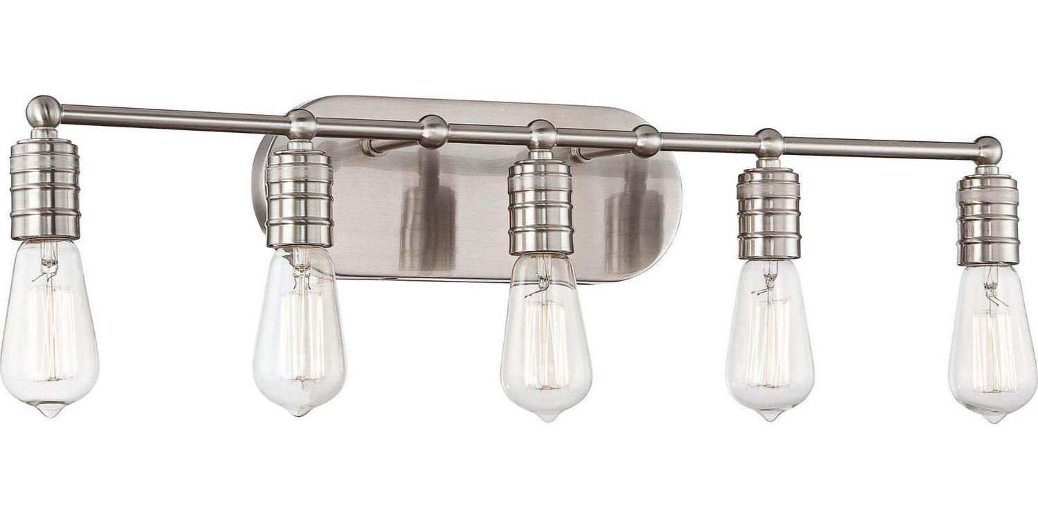 Minka Lavery-5136-84-Collection: Downtown, Material: Steel, Finish Color: Brushed Nickel, Width: 28.25″, Height: 8.25″, Depth: 5″, Backplate Width: 12″, Backplate Length: 4.5″, Lamping Type: Incandescent, Number Of Bulbs: 5, Wattage: 40 Watts, Dimmable: Yes, Moisture Rating: Dry Rated, Desc: ,-Downtown – 5 Light Contemporary Bath Vanity in Transitional Style – 4.5 inches tall by 27.5 inches wide