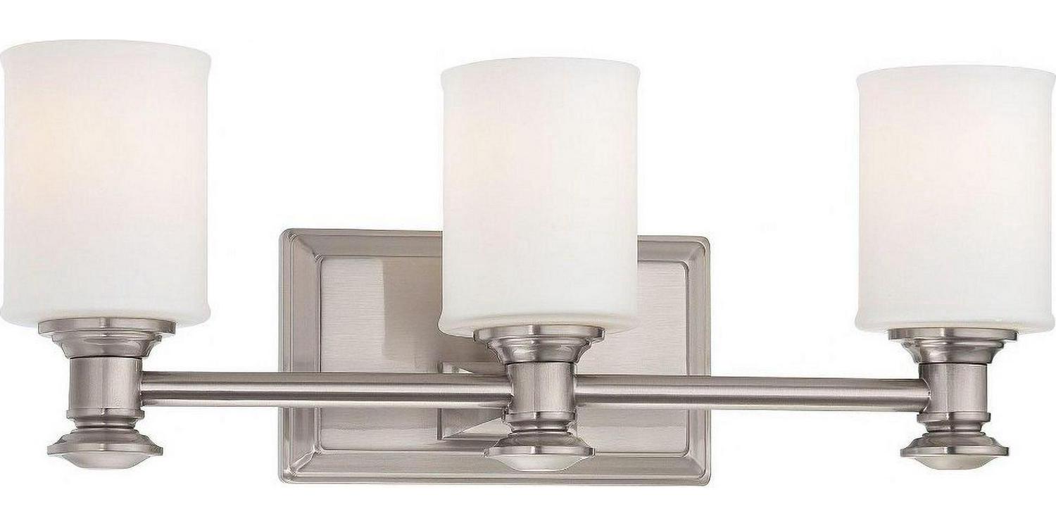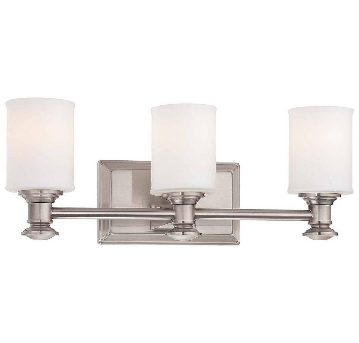 Minka Lavery-5173-84-Collection: Harbour Point, Material: Glass, Finish Color: Brushed Nickel, Width: 19″, Height: 7.25″, Depth: 6″, Backplate Width: 8″, Backplate Length: 4.5″, Lamping Type: Incandescent, Number Of Bulbs: 3, Wattage: 100 Watts, Dimmable: Yes, Moisture Rating: Dry Rated, Desc: Mounting Direction: Reversible / Shade Included: TRUE. ,-Harbour Point – 3 Light Transitional Bath Vanity in Transitional Style – 7.25 inches tall by 19 inches wide-Brushed Nickel Finish