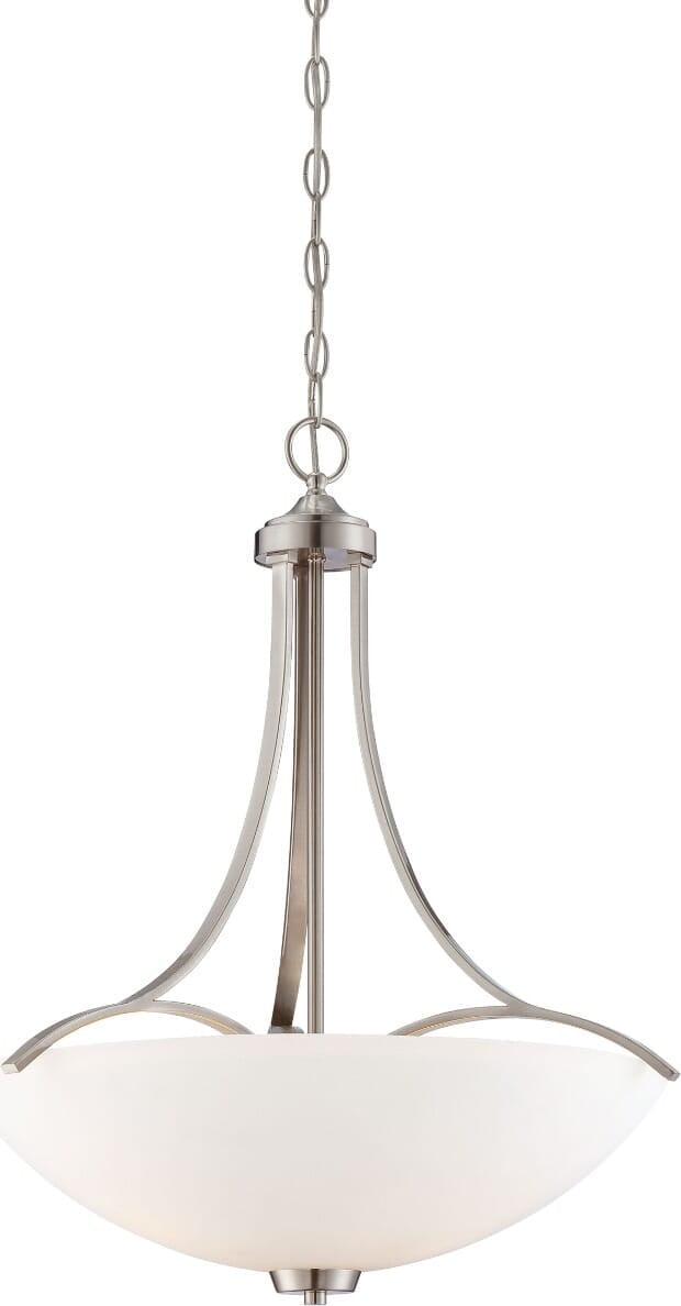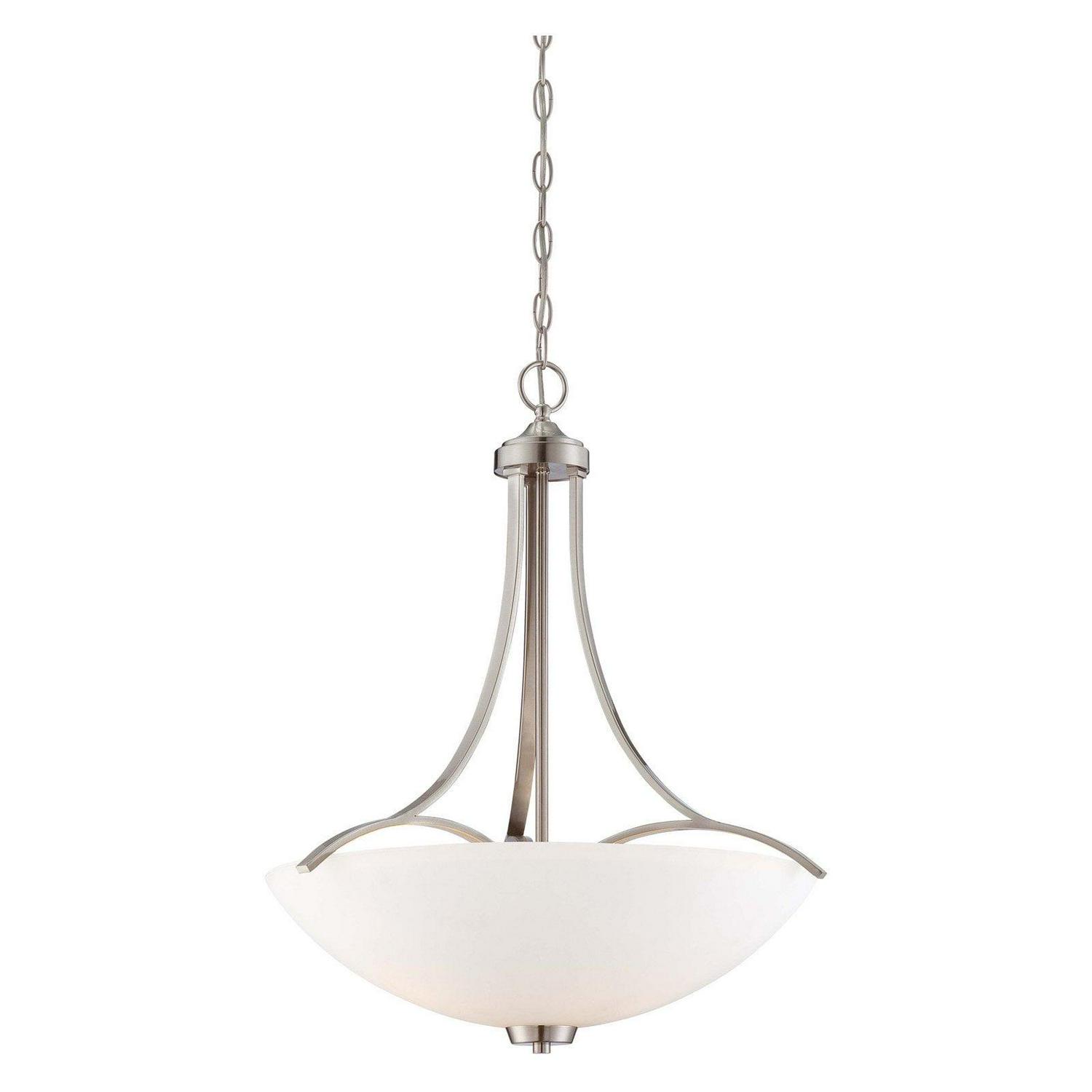 Searching for a light that will freshen the appearance of your home and stand the test of time The easygoing Overland Park pendant from Minka Lavery is a great choice. This stylish and straightforward pendant presents a current and classic look that is amenable to many types of decor. Its brushed nickel shade holder offers a few elegant curves and its layered etched white glass shade beautifully diffuses light for a warm and welcoming ambience. Hang this pleasing pendant over an entryway, stair