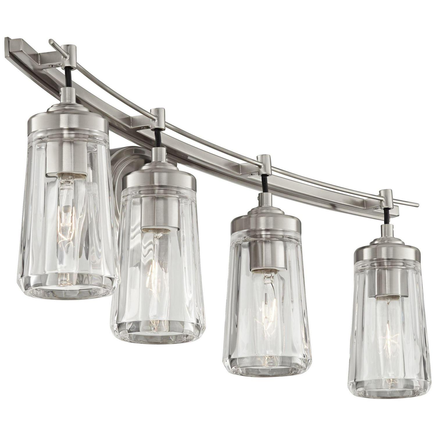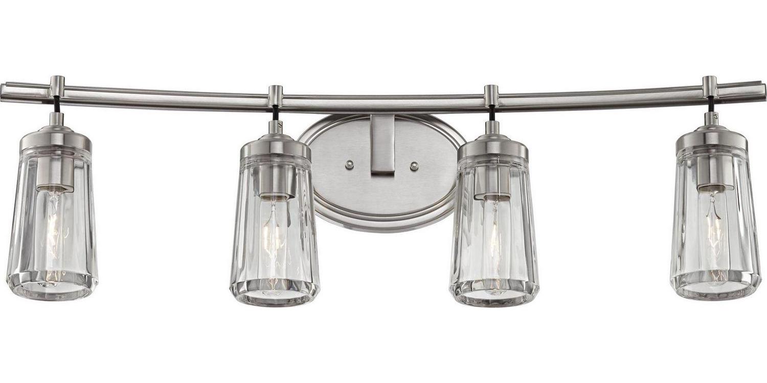 Minka Lavery-2304-84-Collection: Poleis, Material: Steel, Finish Color: Brushed Nickel, Width: 32″, Height: 9″, Depth: 7″, Backplate Width: 8″, Backplate Length: 5.38″, Lamping Type: Incandescent, Number Of Bulbs: 4, Wattage: 60 Watts, Dimmable: Yes, Moisture Rating: Dry Rated, Desc: Mounting Direction: Down / Shade Included: TRUE. ,-Poleis – 4 Light Transitional Bath Vanity in Transitional Style – 9 inches tall by 32 inches wide