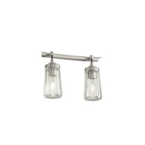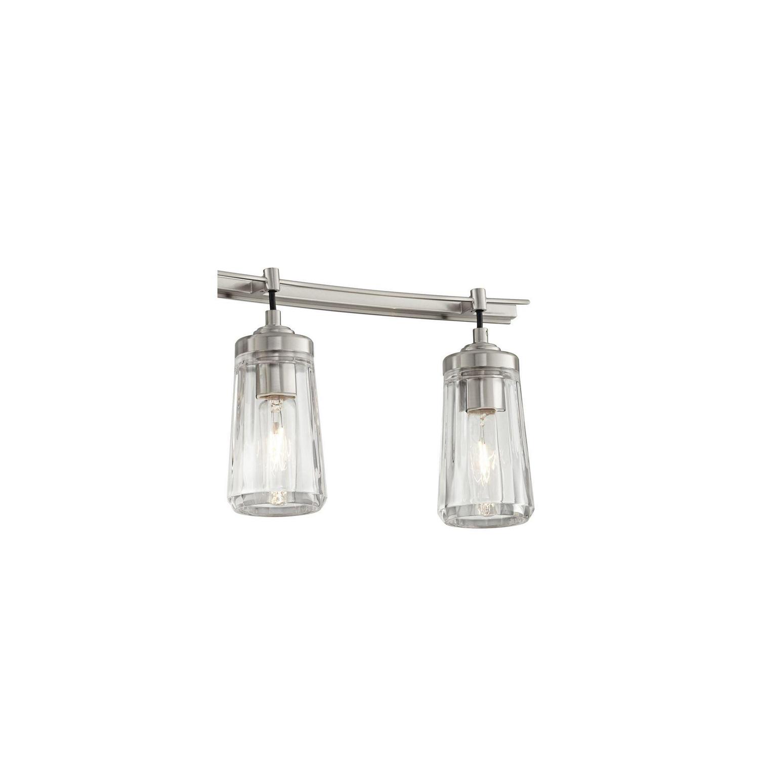 – Brushed nickel finish. Metal construction. Tapered, faceted clear glass shades.