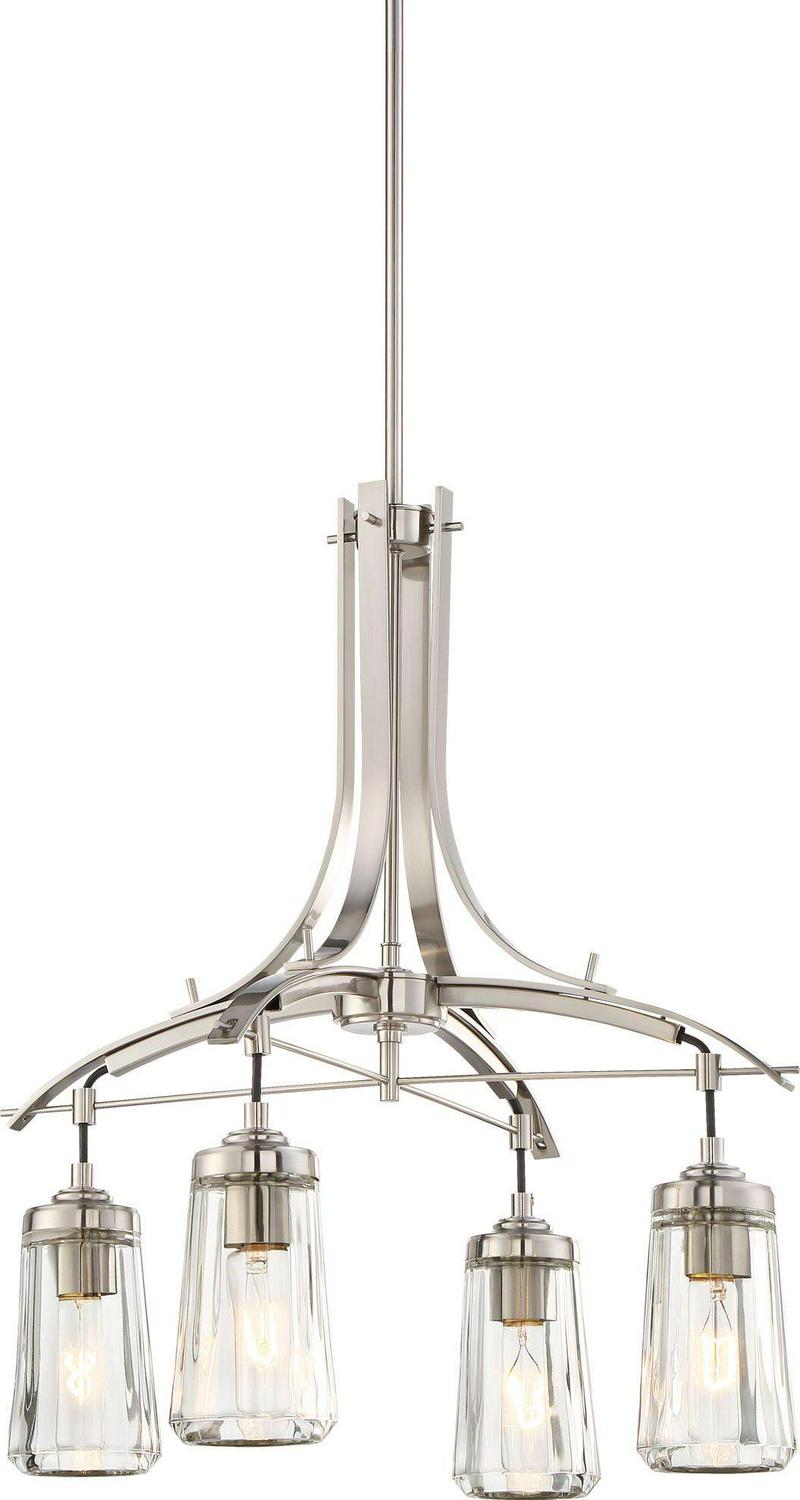 This sleek, four-light chandelier has an updated industrial look with an elegant frame in brushed nickel finish. Perfect for either traditional or contemporary decor, the design features beautiful tapered clear glass. Each glass shade hangs from the bar with wires covered by heavy duty rope.