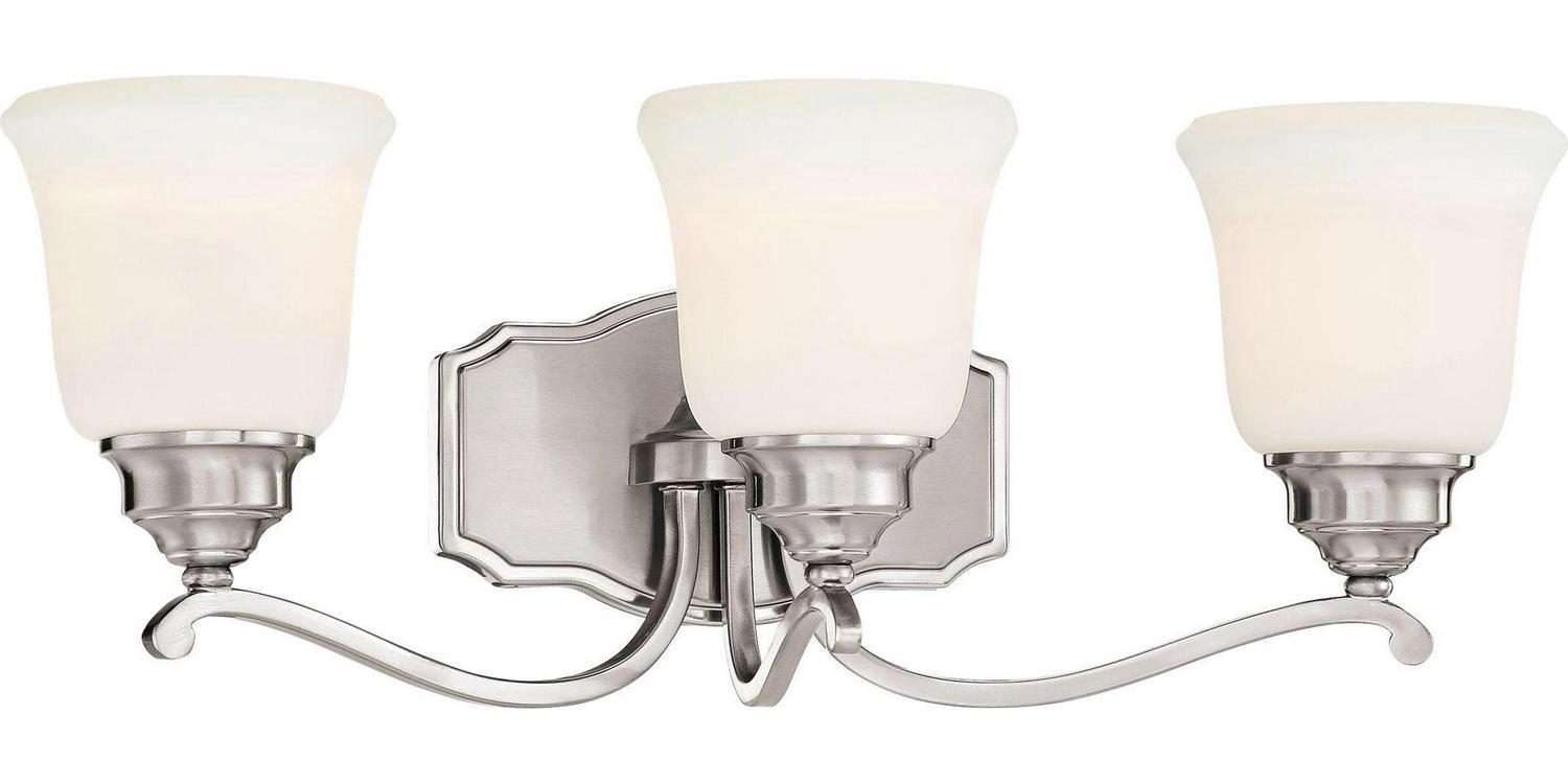 Minka Lavery-3323-84-Collection: Savannah Row, Material: Glass, Finish Color: Brushed Nickel, Width: 22.75″, Height: 8.25″, Depth: 8.25″, Backplate Width: 8.5″, Backplate Length: 5″, Lamping Type: Incandescent, Number Of Bulbs: 3, Wattage: 100 Watts, Dimmable: Yes, Moisture Rating: Dry Rated, Desc: Mounting Direction: Reversible / Shade Included: TRUE. ,-Savannah Row – 3 Light Traditional Bath Vanity in Traditional Style – 8.25 inches tall by 22.75 inches wide