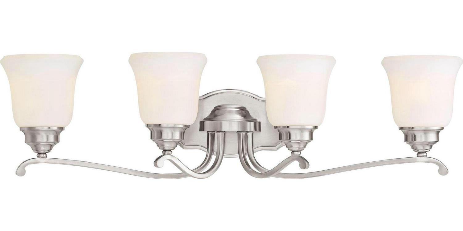 Minka Lavery-3324-84-Collection: Savannah Row, Material: Glass, Finish Color: Brushed Nickel, Width: 31″, Height: 8.25″, Depth: 8.25″, Backplate Width: 8.5″, Backplate Length: 5″, Lamping Type: Incandescent, Number Of Bulbs: 4, Wattage: 100 Watts, Dimmable: Yes, Moisture Rating: Dry Rated, Desc: Mounting Direction: Reversible / Shade Included: TRUE. ,-Savannah Row – 4 Light Traditional Bath Vanity in Traditional Style – 8.25 inches tall by 31 inches wide