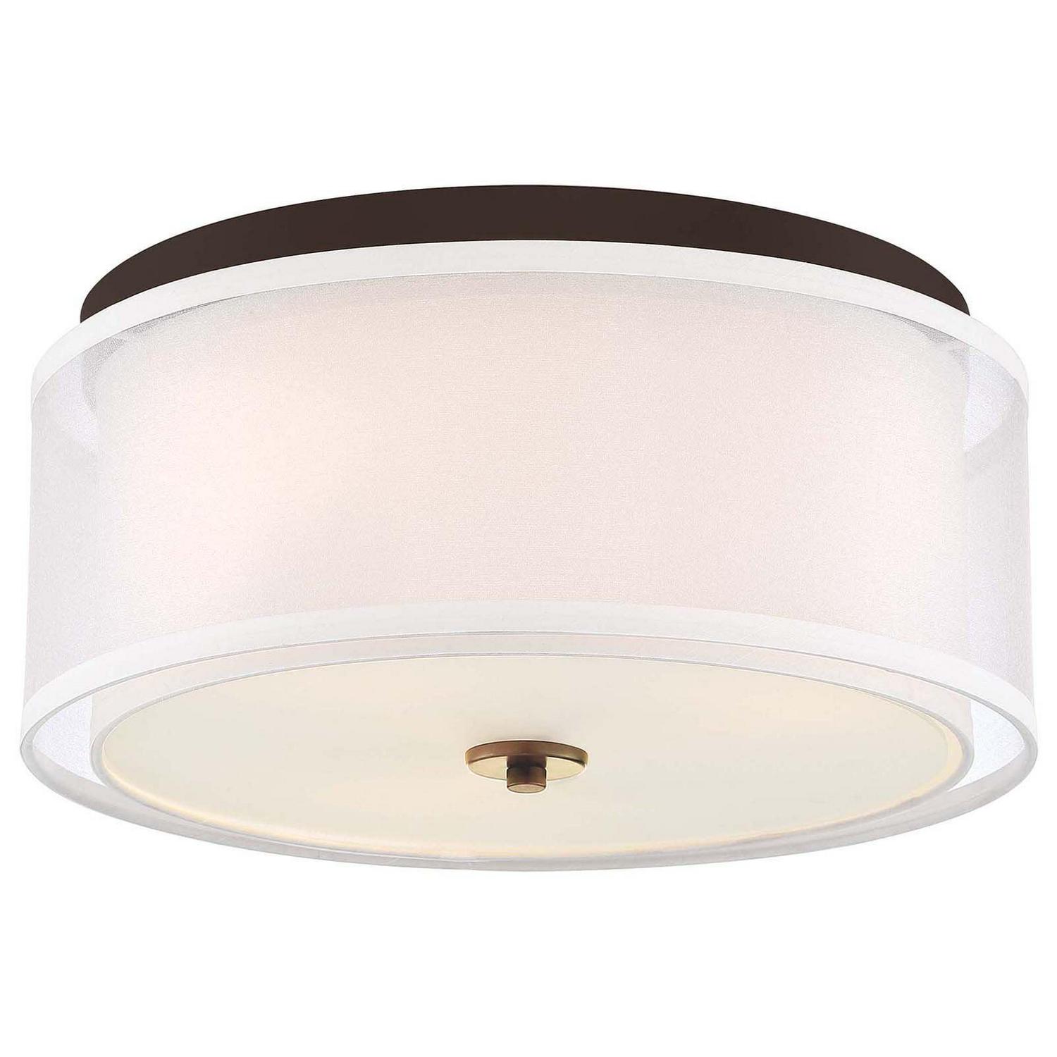 The Minka Lavery Studio 5 3078 Flush Mount offers transitional style and works beautifully in rooms with lower ceilings. Its simple metal fixture is customized by your choice of available finish. For a warm, even glow, this flush-mount ceiling light includes a double drum shades with an etched glass interior and sheer fabric exterior shade. It requires three 60-watt bulbs, which are included with select finish options.