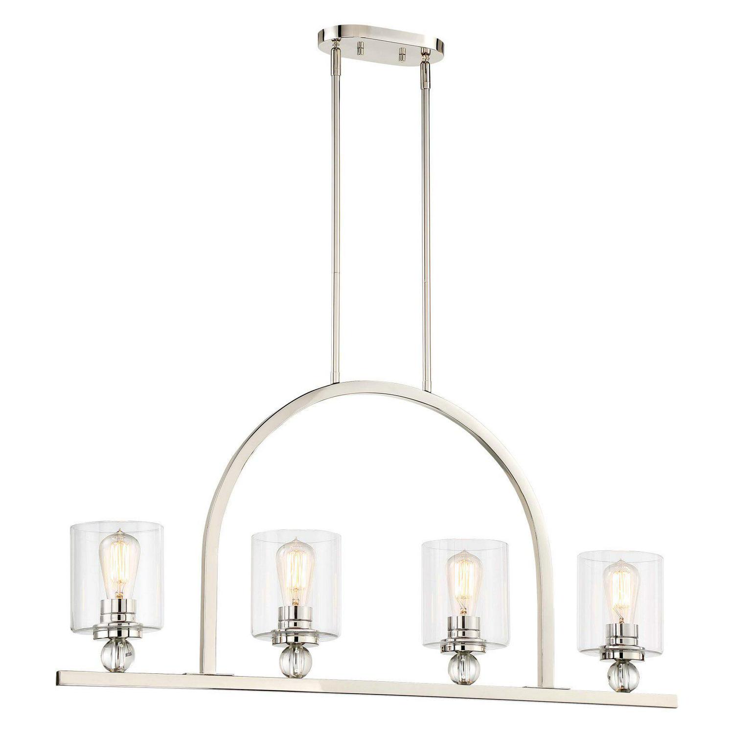 Collection: Studio 5, Material: Glass, Finish Color: Polished Nickel, Width: 5″, Height: 18.75″, Length: 38″, Lamping Type: Incandescent, Number Of Bulbs: 4, Wattage: 60 Watts, Dimmable: Yes, Moisture Rating: Dry Rated, Desc: The Studio 5 family by Minka Lavery is a lifestyle design consistent with urban trends. Glass shades set upon crystals deco orbs make this collection a true design solutions for living. Polished Nickel Finish Exclusive Minka Group Plated Finish