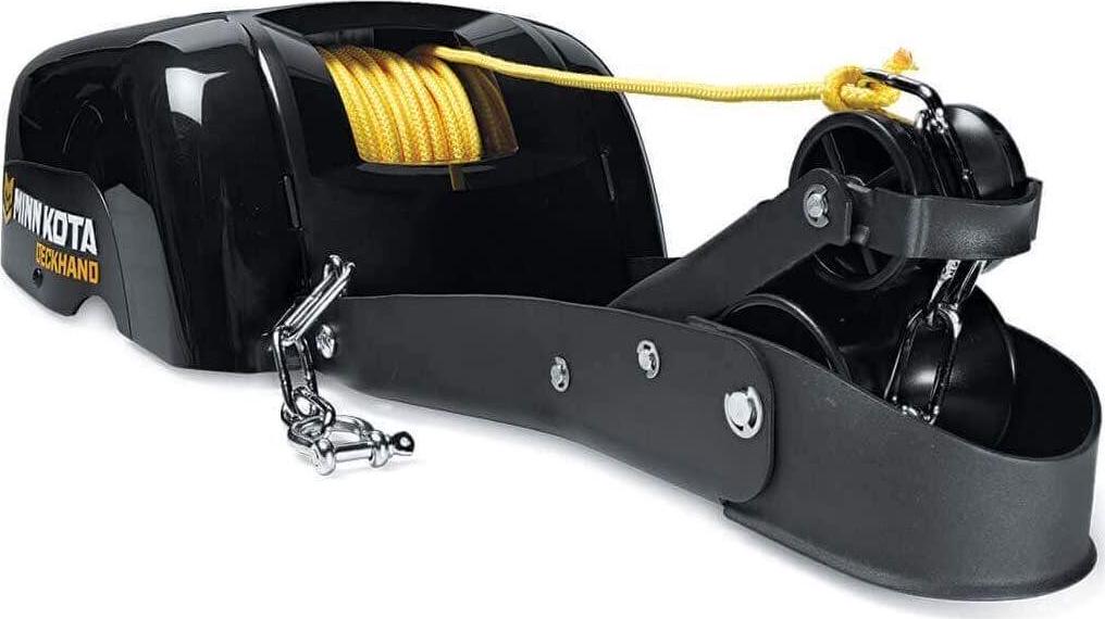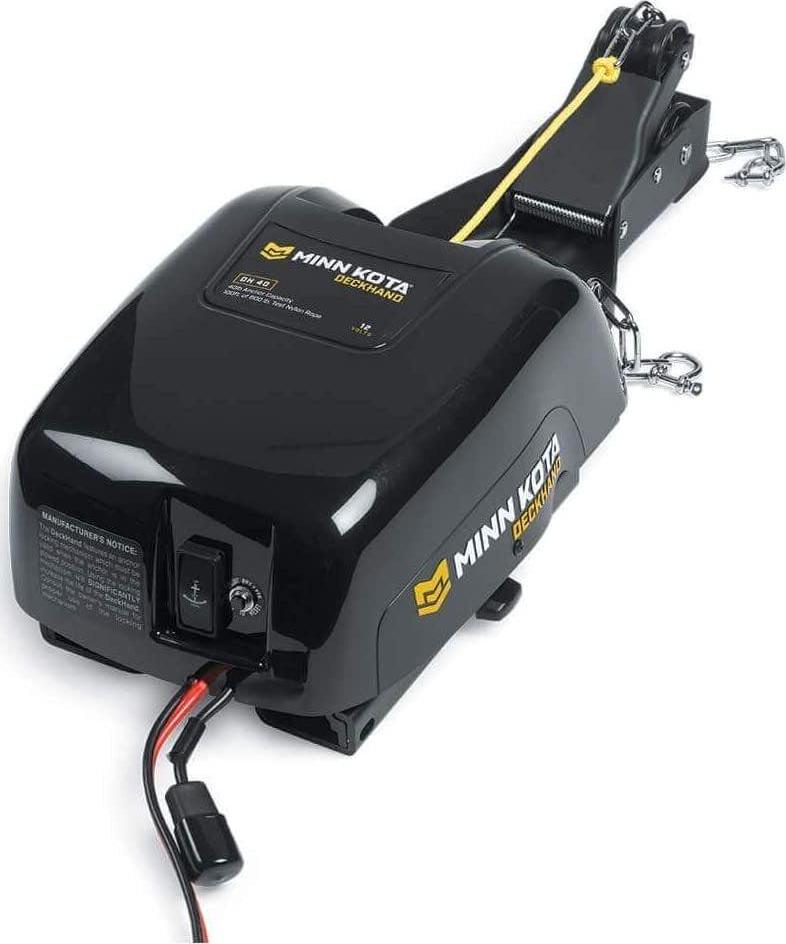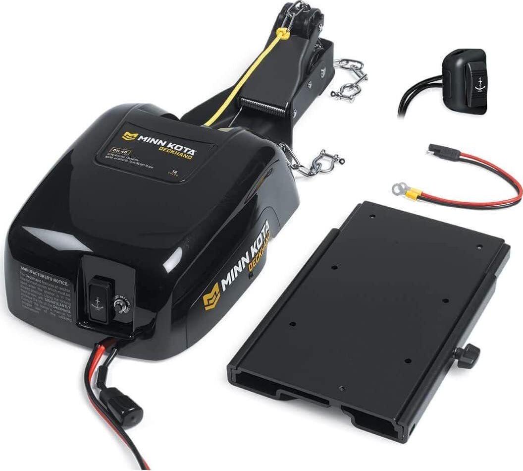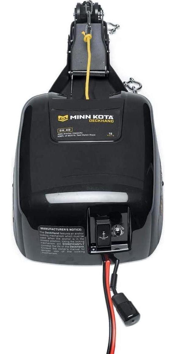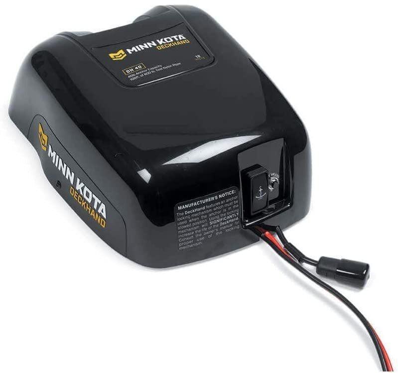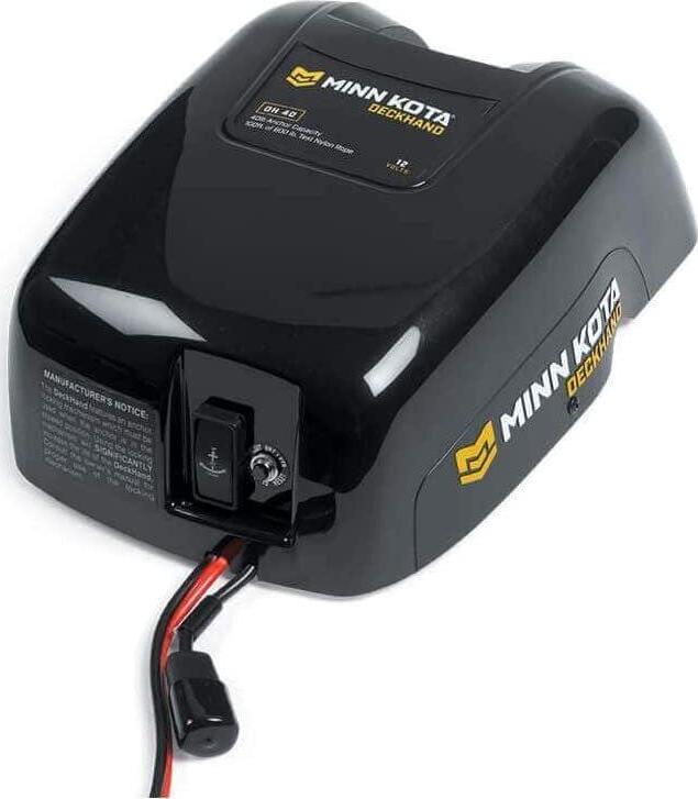 Automatically raise and lower your anchor at the touch of a button. DeckHand 40 has a 40-lb anchor capacity (anchor not included). Pre-spooled with 100 feet of 800-lb test nylon rope. Universal davit can be mounted at base of DeckHand or in remote position on boat deck. Davit also stows anchor horizontally to eliminate anchor swing. Anchor shackle allows for quick changes between anchors. A special anti-drag system senses the bottom to allow for controlled drifting. Runs on 12-volt battery (not included). Remote accessory allows for 25′ corded remote operation. DH 40 is designed to work with anchors weighing at least 20 lbs. and not more than 40 lbs.
