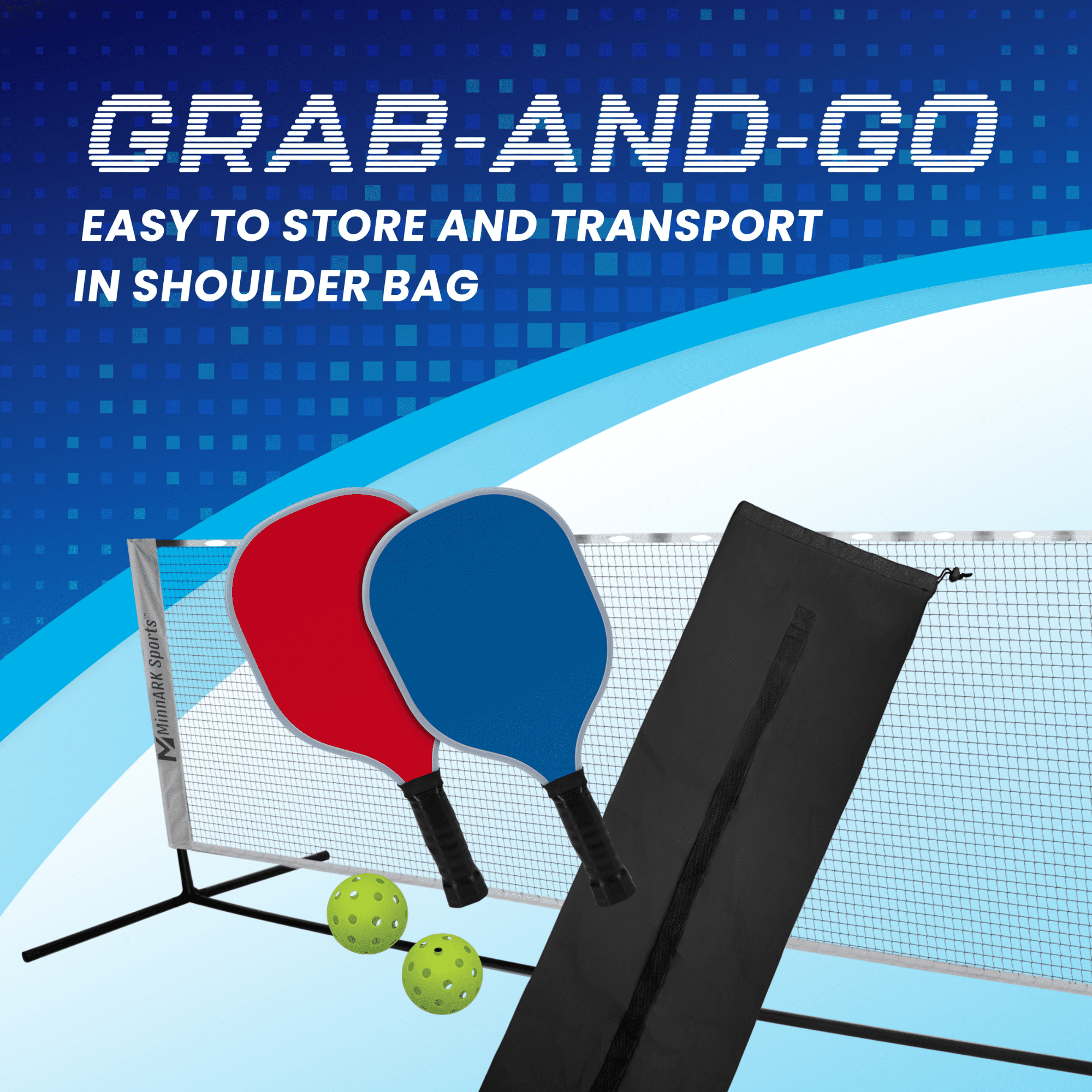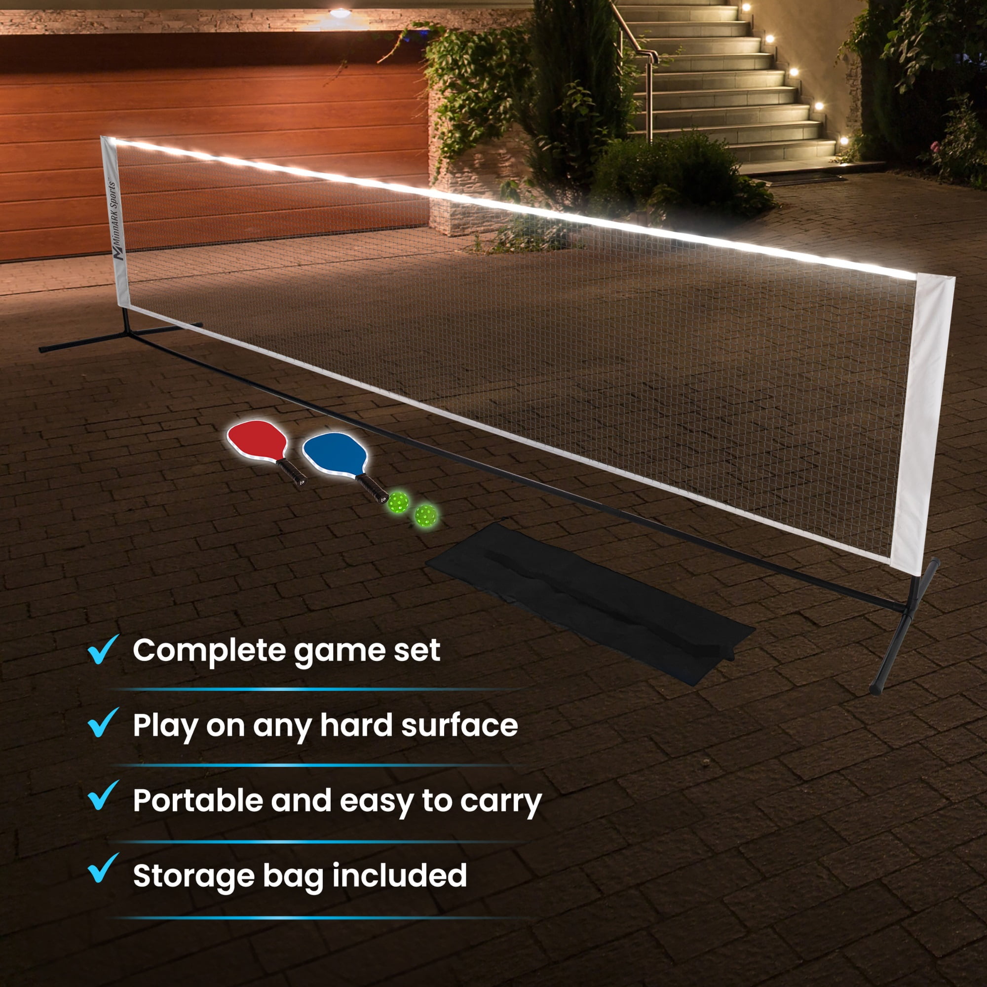 EVERYTHING YOU NEED: This MinnARK Sports set includes a net, 2x paddles, 2x balls, and a storage bag LIGHT-UP FUNCTIONALITY: LEDs in the net, paddles, and balls make nighttime play easy! EASY SETUP: Get ready to play in no time! LEARN PICKLEBALL SKILLS: This set is perfect for all ages, even for beginners! STORAGE BAG INCLUDED: After play is done, all pieces break down and fit in the included back,