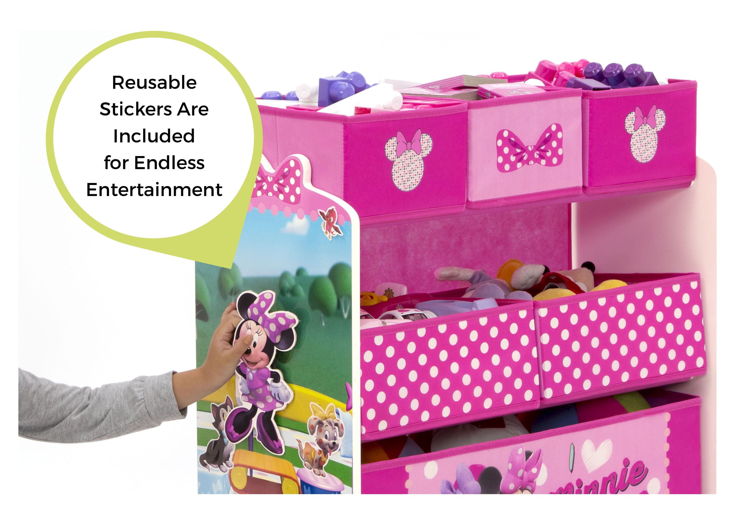 Create the cutest Clubhouse with this Minnie Mouse 4-Piece Playroom Solution by Delta Children. A versatile set that provides both seating and storage, it includes a pink wooden play table with 2 chairs and a 6-bin toy organizer. The wooden play table and 2 chairs are the perfect kid-size height and feature bold Minnie Mouse graphics. The 6-Bin Toy Organizer features a sturdy wooden frame that holds six fabric bins sized for every type of toy, so you can store books, blocks, and more. The toy bin also comes with reusable vinyl cling stickers that allow your child to decorate the sides themselves. Built from sturdy materials, these pieces will standup to years of playtime.