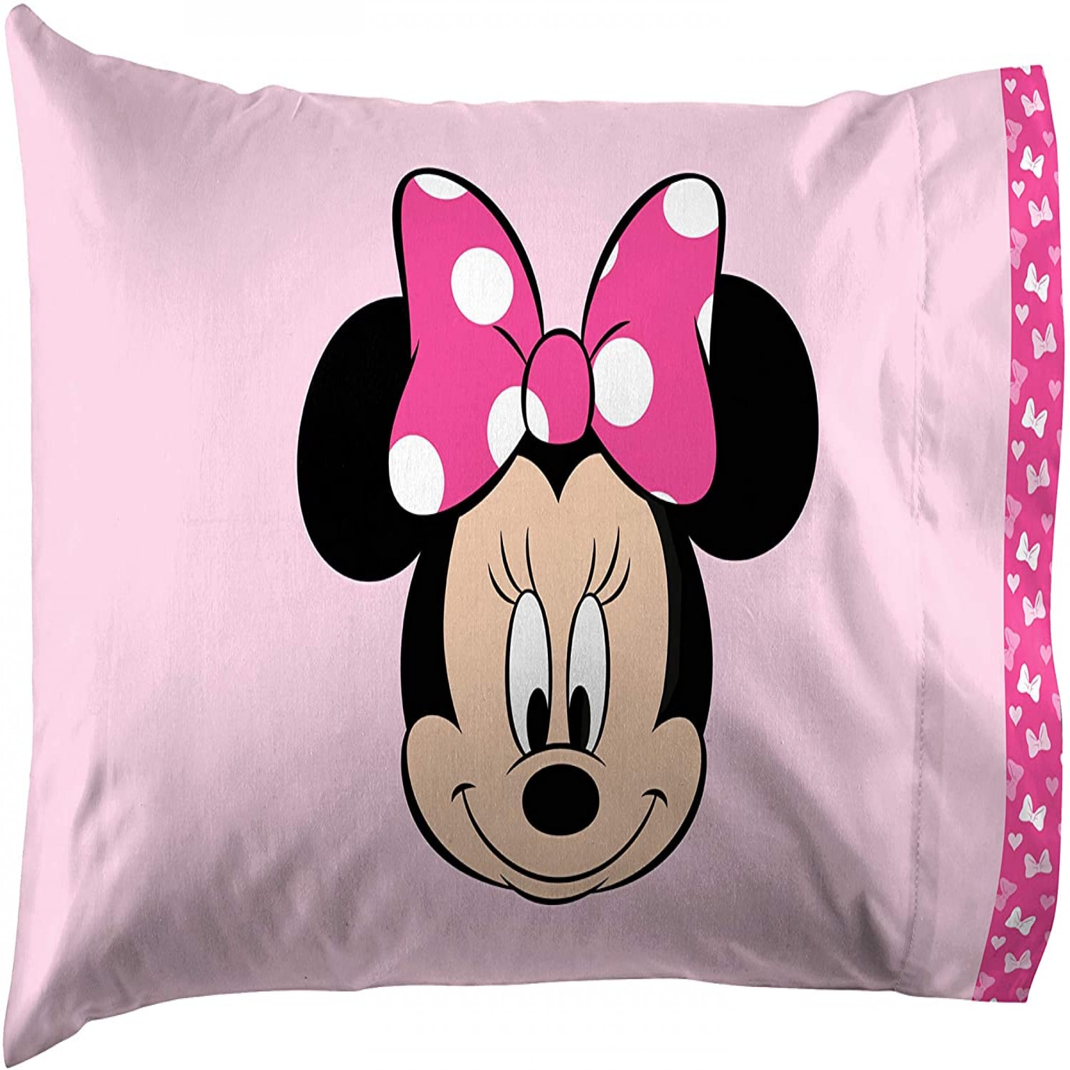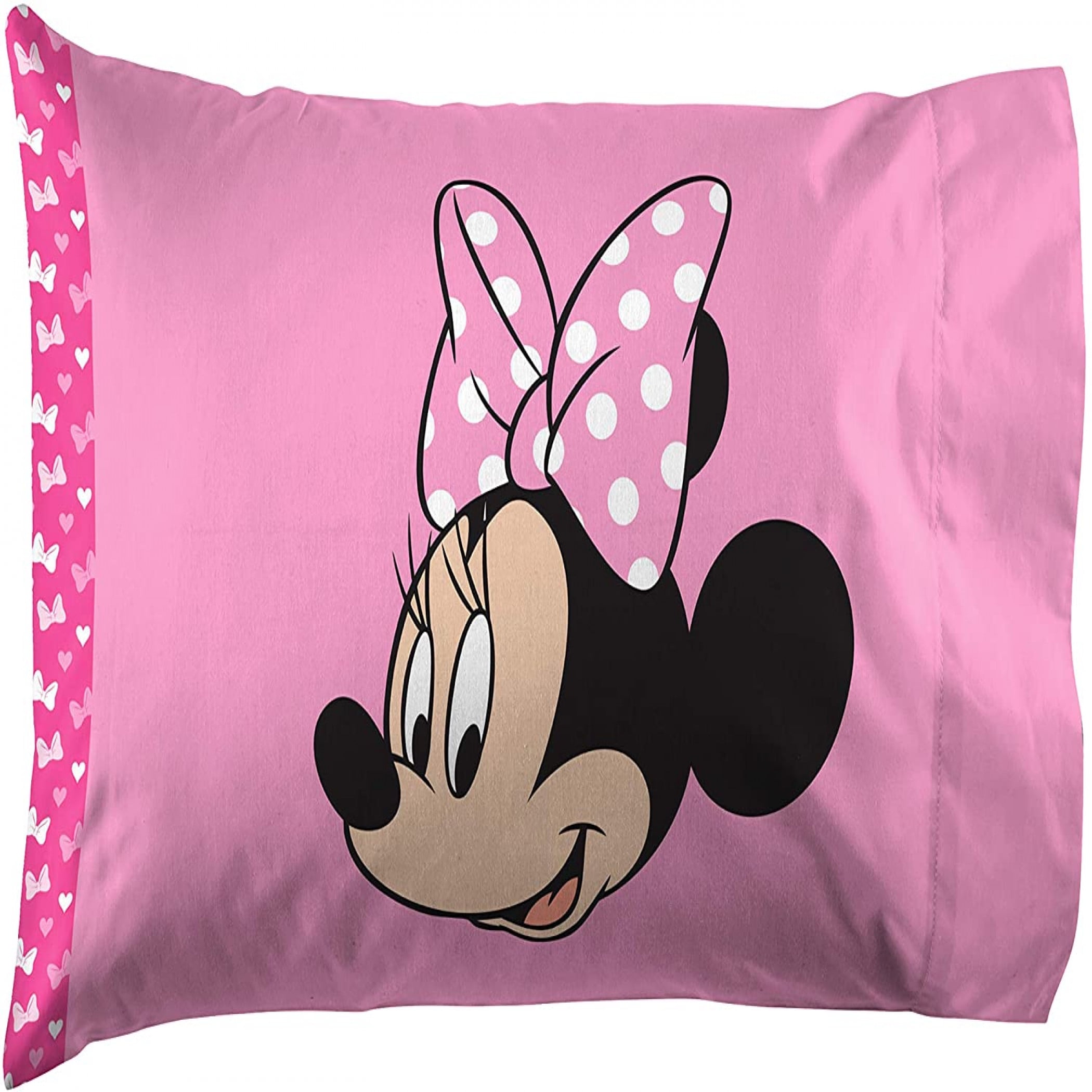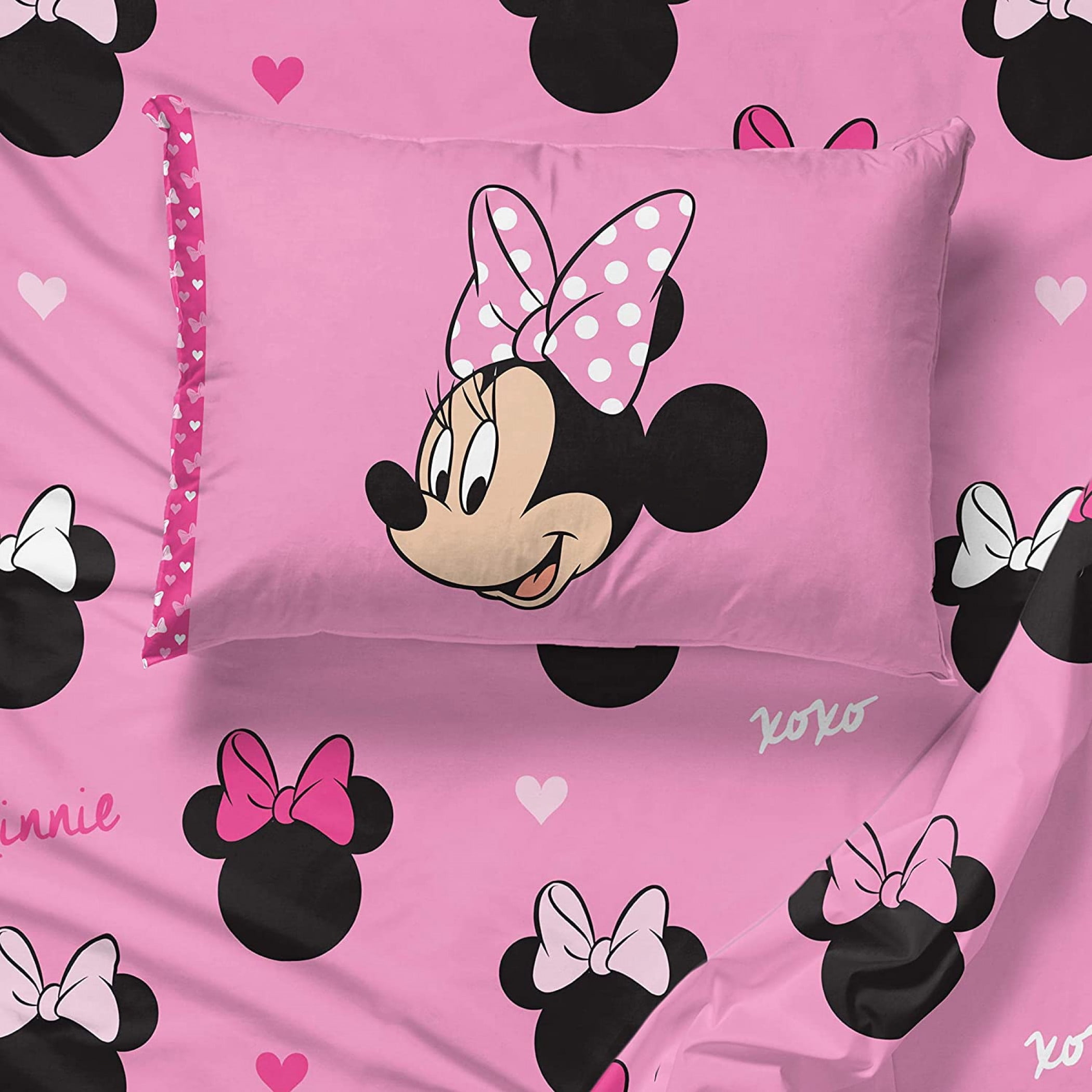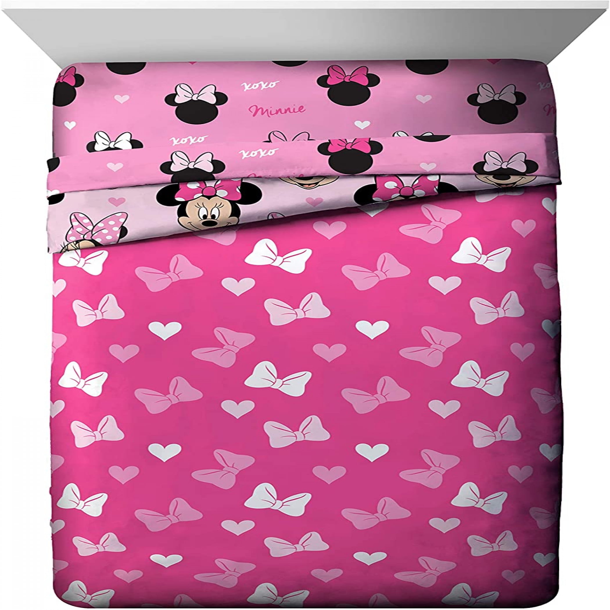 Set features an allover print of Minnie Mouse in light and dark pink dotted bows 100% Microfiber 85 GSM Set includes a comforter. fitted sheet, flat sheet, and a standard sized pillowcase Perfect for the Minnie Mouse fan in yourlife