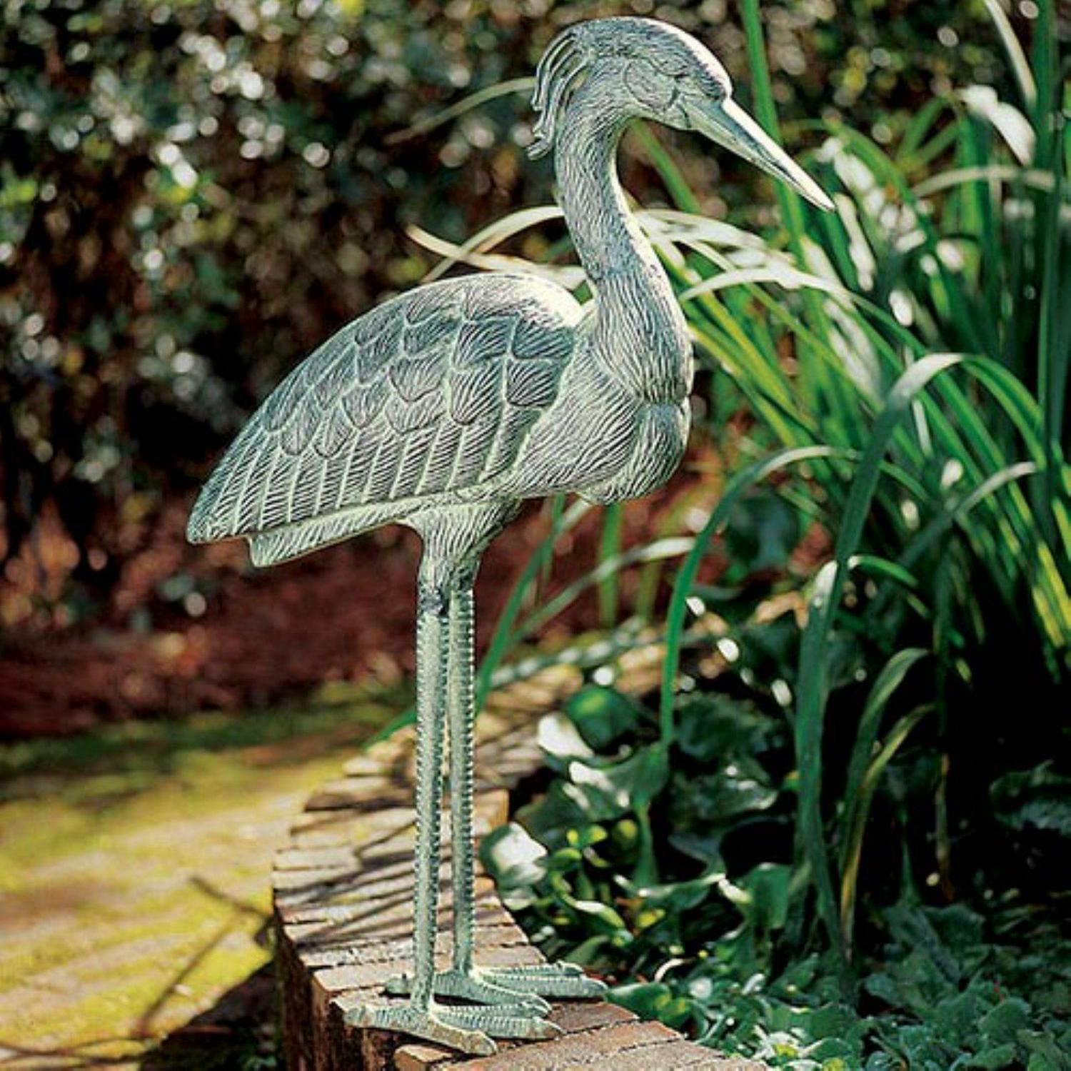 Decorate your garden or yard using the Stately Blue Heron. Elegant and graceful, this statue will blend in with any natural surroundings. Keep it by a walkway in your backyard or by a flowerbed in your garden to enhance its ambience. It s constructed of cast aluminum, which makes it highly durable and perfect for outdoor use. With a Verdi finish, it has a beautiful hue that complements any natural environment.