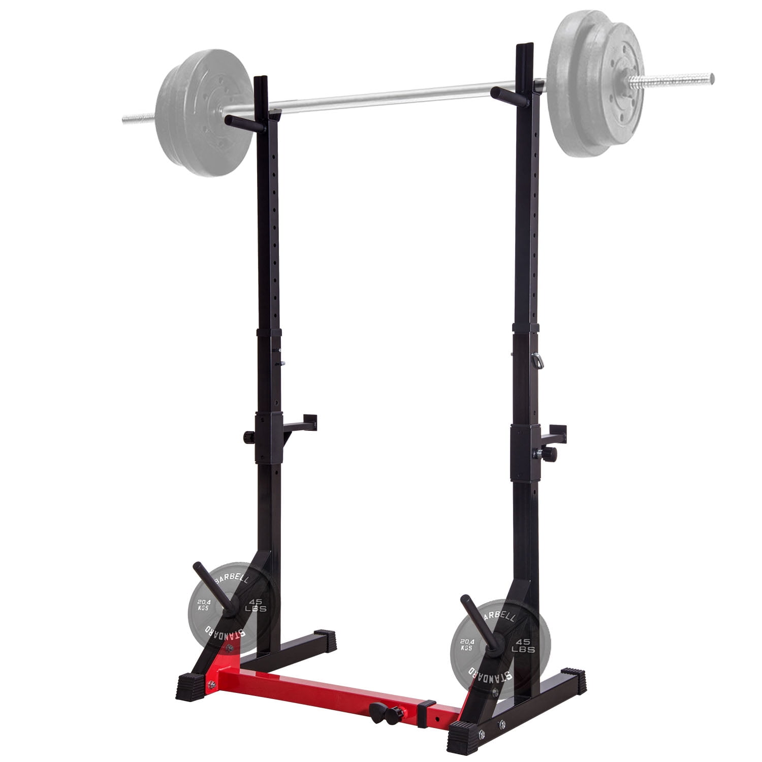 Durable: premium steel with spraying surface Heavy Duty: solid structure with high capacity up to 480lb Double Height Adjustable : Adjustable Barbell Rack that suitable for a variety of height requirement. Bracket Height range of 46.8”-68.1”; Base range of 30.3”-48” Portable space saving design is Compatible with rage spotter arm Package Include * 1 x Multi-function Barbell Rack * 1 x Hardware Set * 1 x Instruction