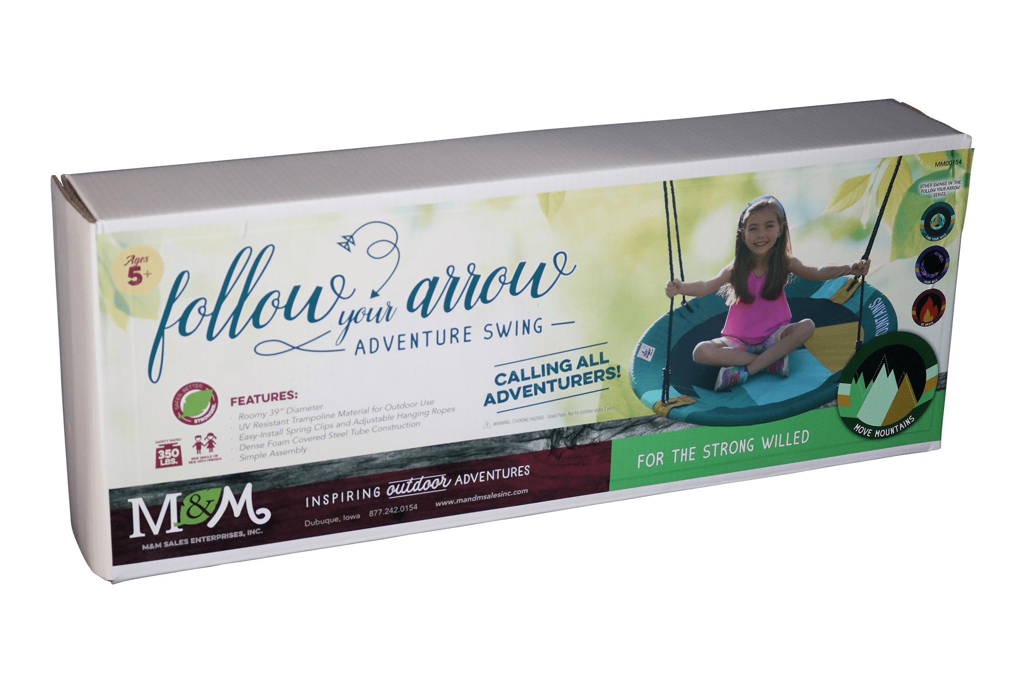 M&M Sales Enterprises Inc Move Mountains Adventure Mat Swing: Safety rated 250 lb Rated for ages 5+ Designer and roomy 39″ diameter platform swing UV resistant trampoline material for outdoor use Easy install 4″ monster steel spring clips and adjustable hanging ropes Dense foam covered steel tube construction Simple assembly