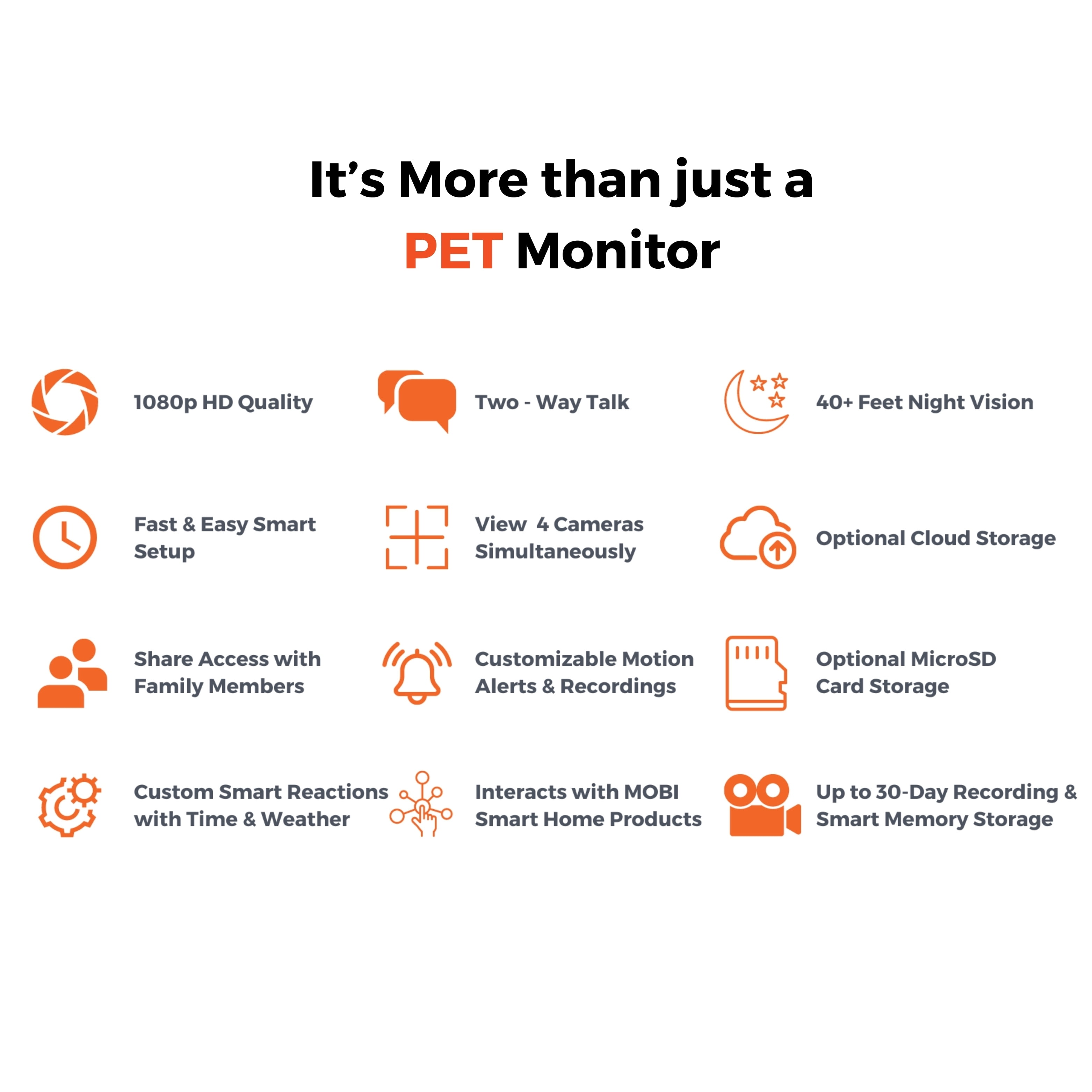 Introducing the MOBI Pet and Baby Video & Audio Monitoring Camera – the ultimate solution for pet owners seeking to stay connected with their furry friends from anywhere, at any time while watching Full HD 1280 x 720 video with 30 fps covers 110 degrees. With its advanced secure wireless connection, you can now have peace of mind knowing that your pet is safe and sound. The MOBI Pet Monitoring Camera is equipped with powerful night vision up to 40′, and 2-way audio with playback, ensuring you never miss a moment with your beloved pet. What’s more, this product is designed to accommodate multiple users, with secure video encryption for up to 15 authorized users, so you can share access with family members and pet sitters, all while maintaining complete security and peace of mind. Easy-to-follow instructions can be accessed via an internal voice prompt, making the MOBI Pet Monitoring Camera incredibly user-friendly. So, whether you’re at work or on vacation, you can always stay connected to your pet and know they are safe with the MobiCam Pet Monitoring Wi-Fi Camera.