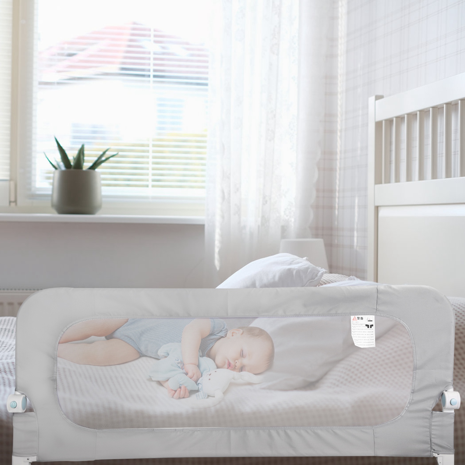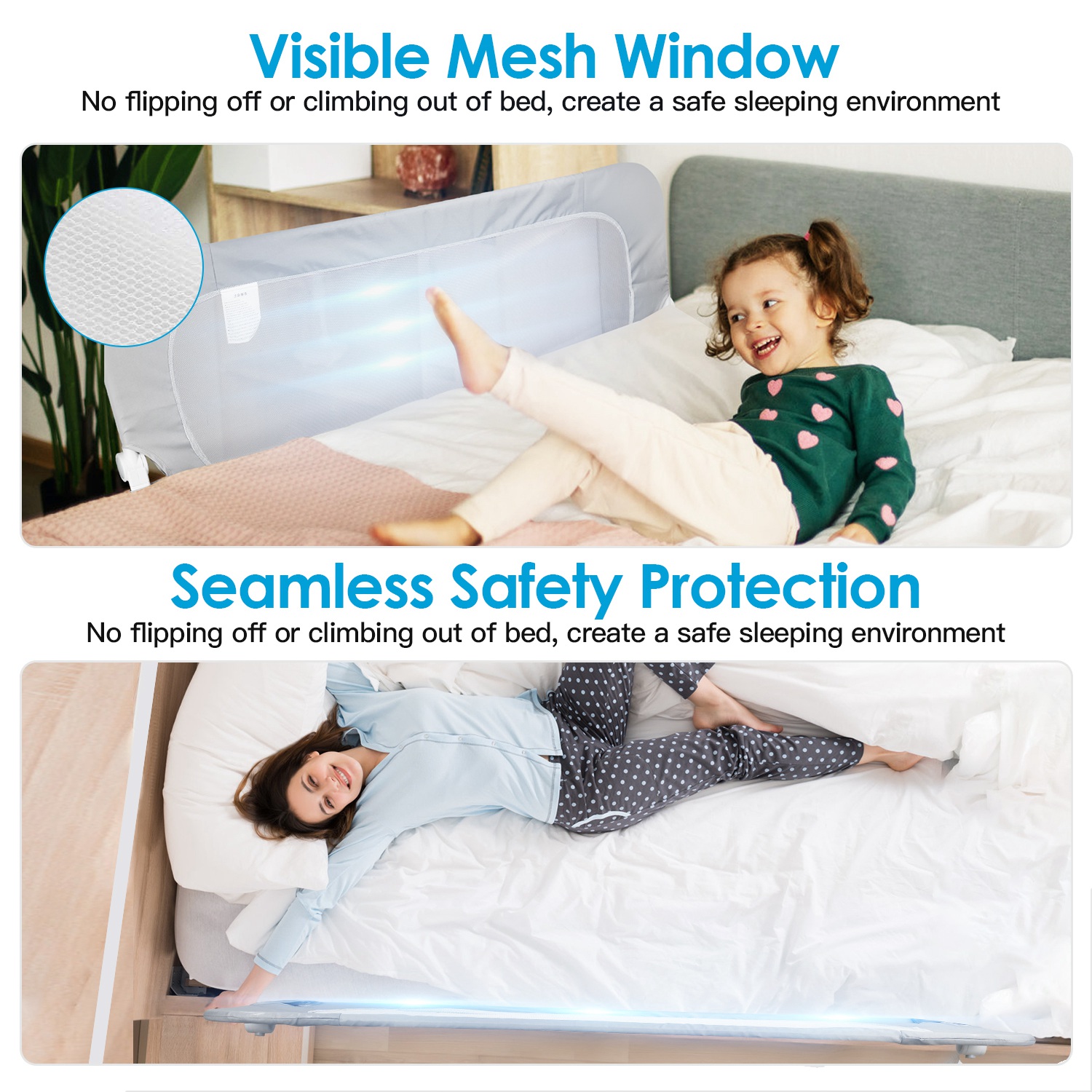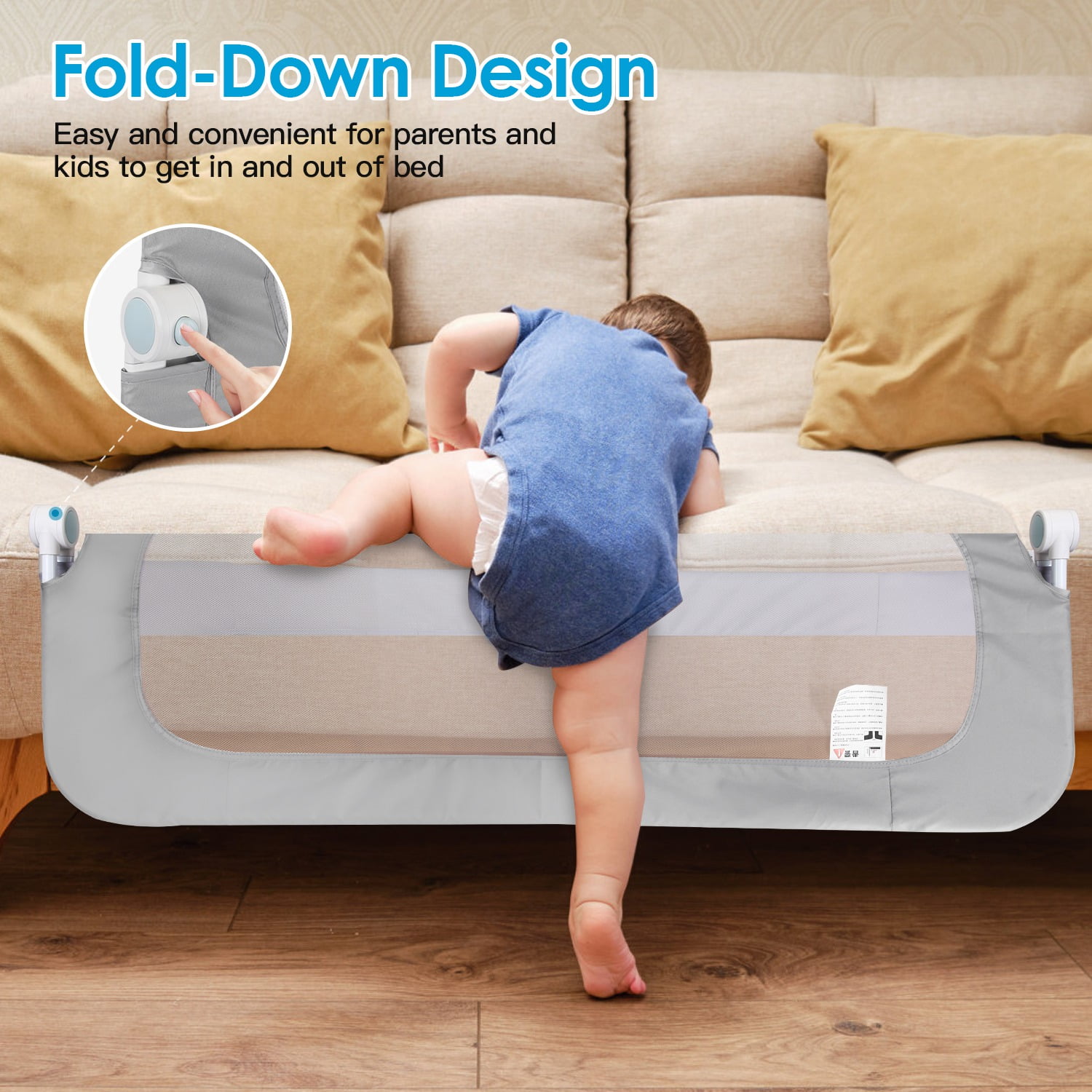 Our Moclever 57.48in extra-long toddler bedrail guard is constructed with a sturdy and durable iron frame, ensuring reliability and durability. And odorless, skin-friendly mesh fabric makes every movement of your baby visible. With just one click of a button, you can effortlessly fold down the rail to make getting in and out of bed easier than ever. Easily remove the cloth cover and wash it to keep the bedrail clean. Universally compatible with most types of beds.