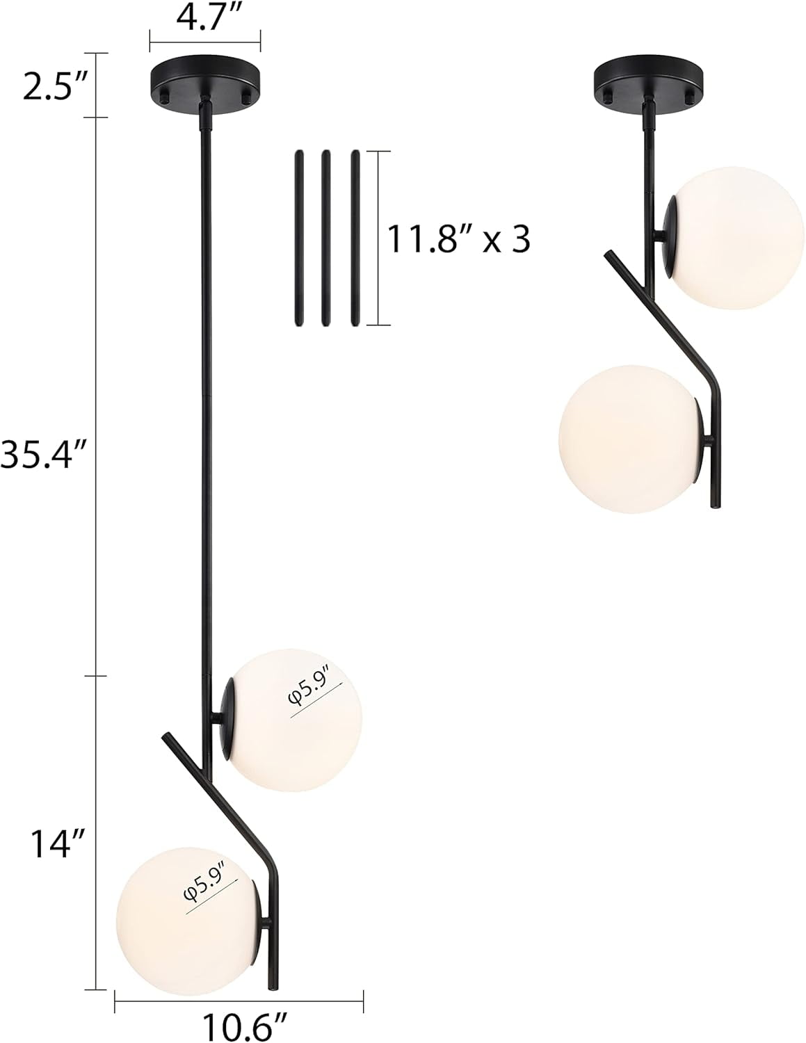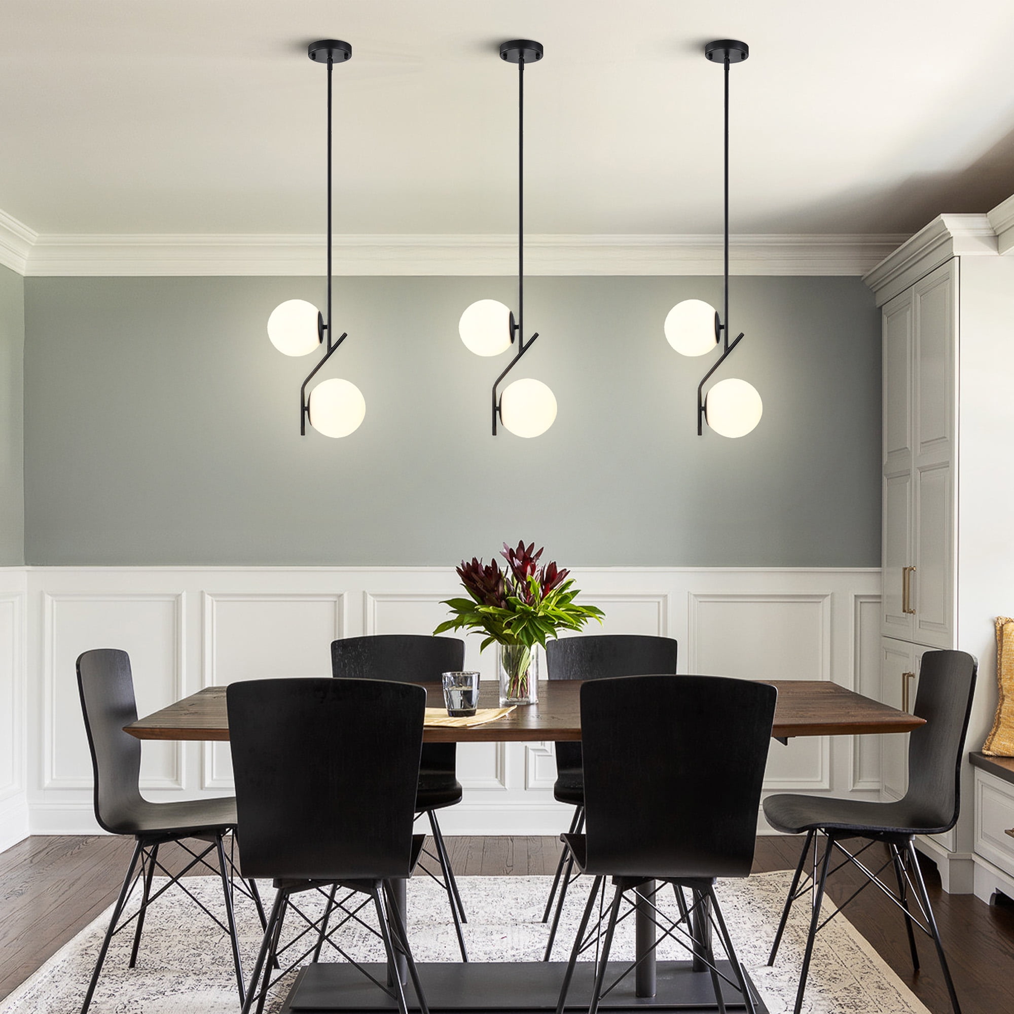Sleek Design: This 2-light black pendant fixture combines a matte-black finish with opal glass globes, embodying modern aesthetics and mid-century style. Bulb Requirements: Pendant lights requires 2 x E12 Base 40W Bulb, It is compatible with LED, Incandescent and Halogen Bulbs etc. Rotated Accessories for Sloped Ceiling: with a adjustable adapter, pendant lights is perfect for sloped ceilings or vaulted roofs. The elegant matte black finish complements a variety of interior styles. Adjustable Length: Pendant light includes 3 extend rods (11.8â each), allowing you to customize the height to meet your specific needs. Versatile Placement: Perfect for kitchen islands, dining rooms, and more, it offers both style and functionality. Easy Installation: Comes with all necessary mounting hardware and a detailed installation guide for quick setup.