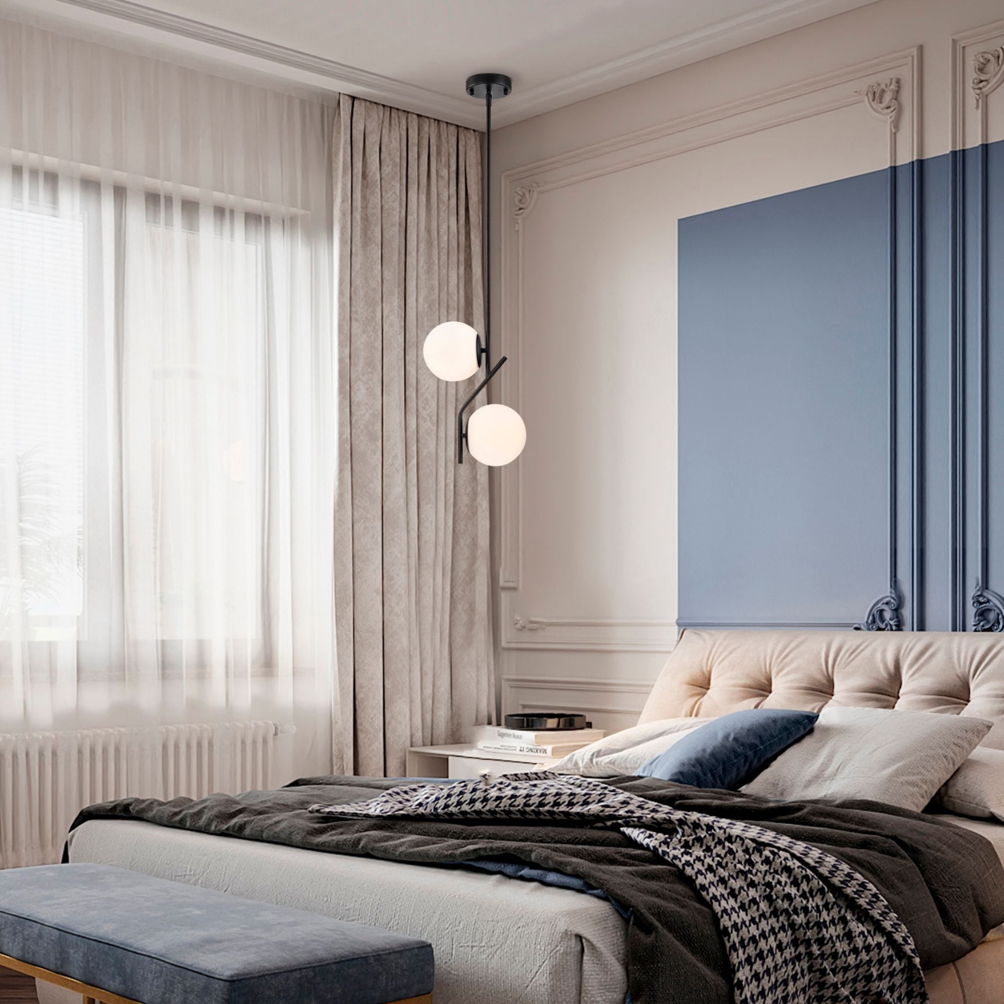 Modern 2-light pendant fixture combines a sleek matte-black finish with opal glass globes, creating a sophisticated blend of contemporary and mid-century style. Designed to be versatile, it can be used in a variety of spaces, including kitchen islands, bedroom, dining rooms, and living rooms. The adjustable height and adapter for sloped ceilings make it easy to customize the fixture to your specific needs, while the included mounting hardware and detailed installation guide ensure a straightforward setup. Powered by 2 x E12 base bulbs (not included), this pendant light is compatible with LED, incandescent, and halogen bulbs, offering you the flexibility to choose the perfect lighting solution for your space.