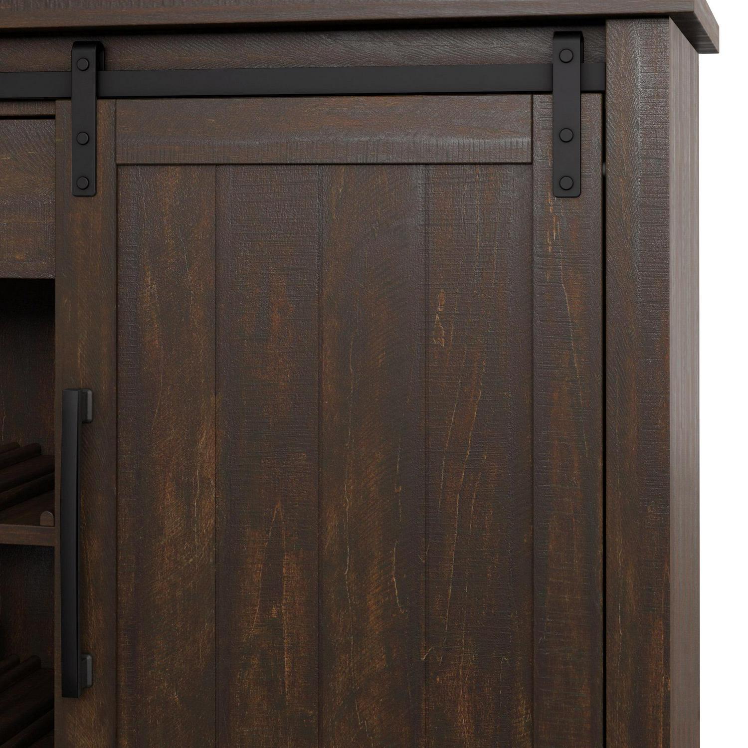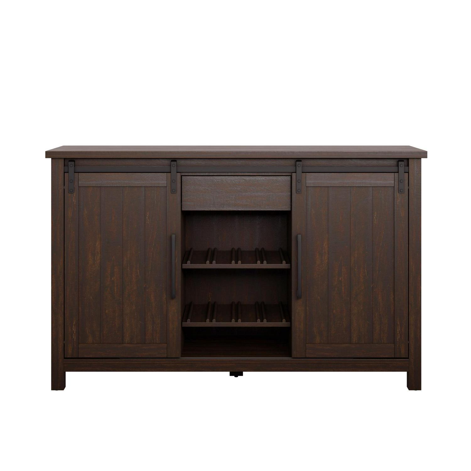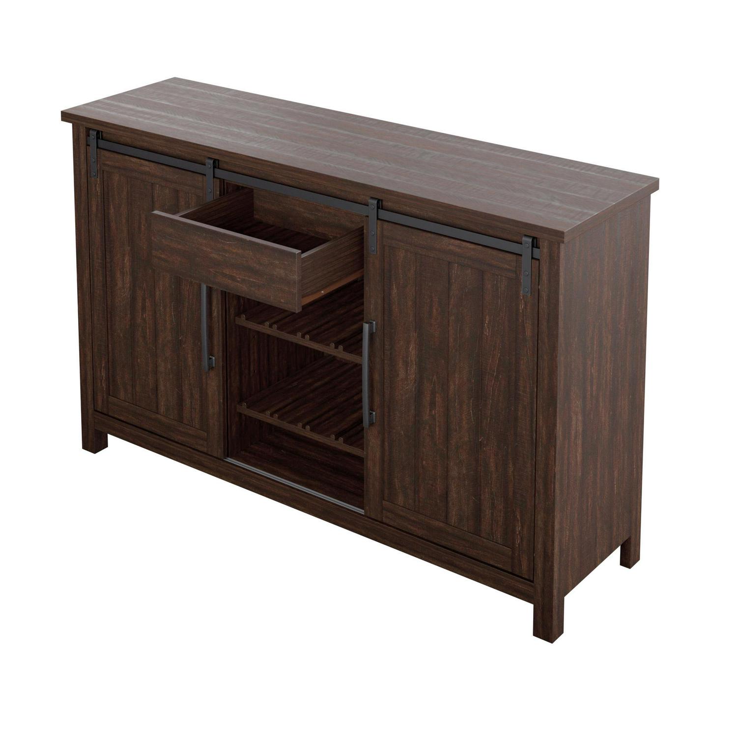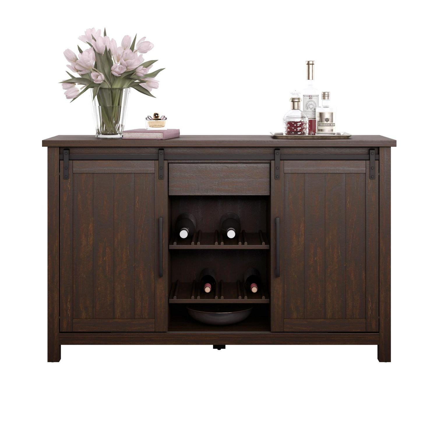 Add rustic charm to your space with a modern farmhouse sideboard. The two center shelves are adjustable with a slotted side that can accommodate optional wine storage. Each center shelf can hold up to four bottles of your favorite wine. The side cabinets also come with an adjustable shelf for flexible storage that meets your needs. The center storage drawer is ideal for napkin rings, candlesticks, and other small items that need a home.