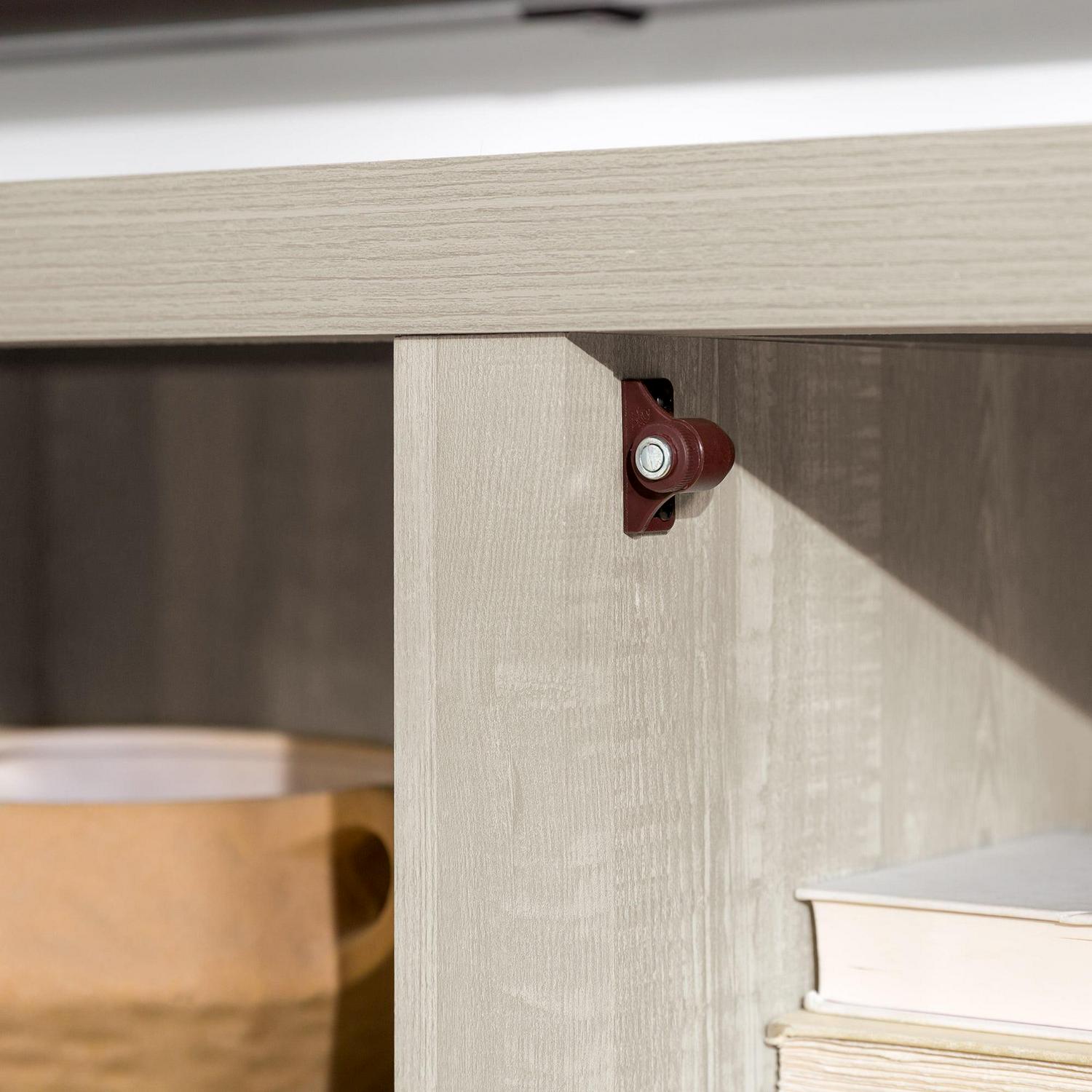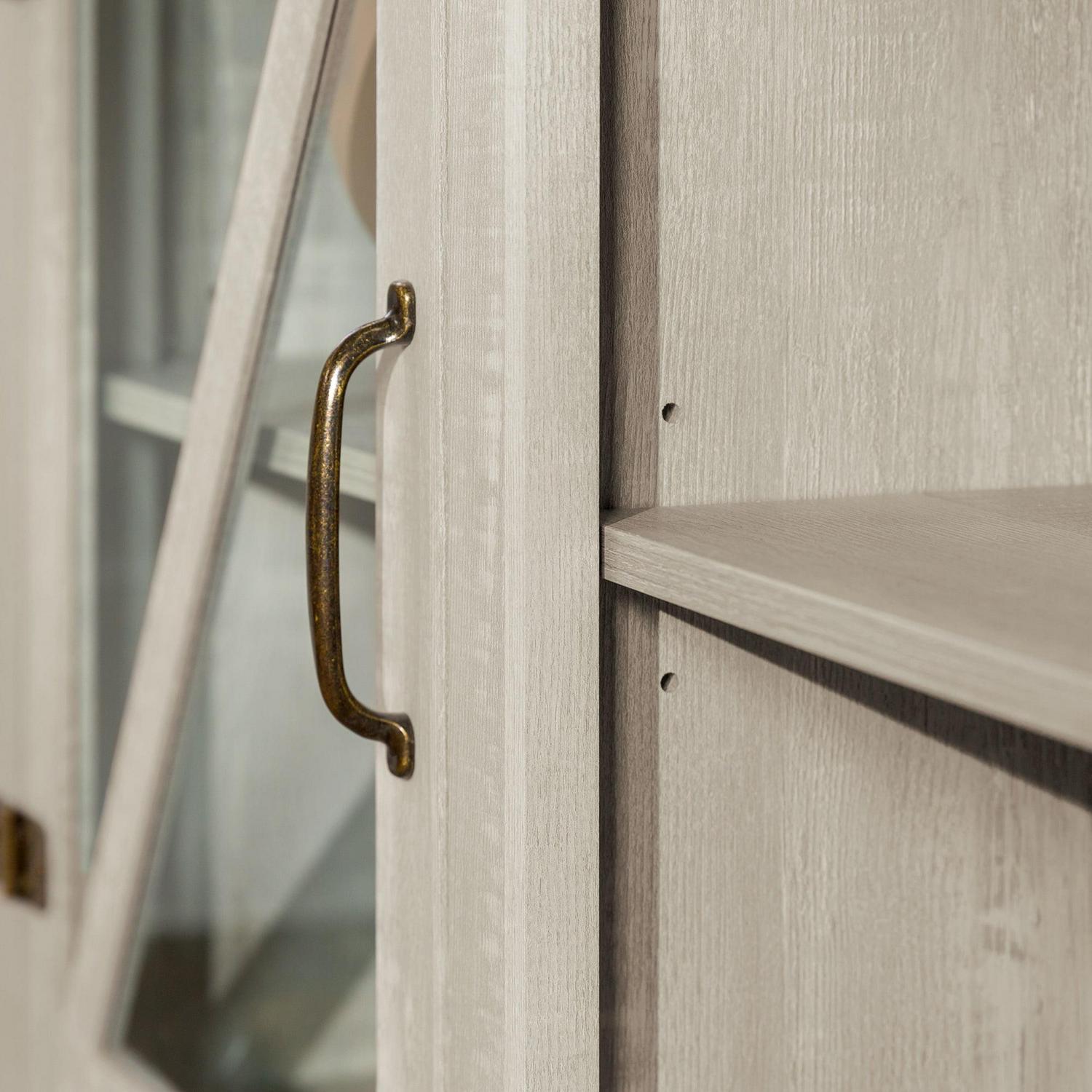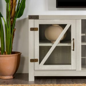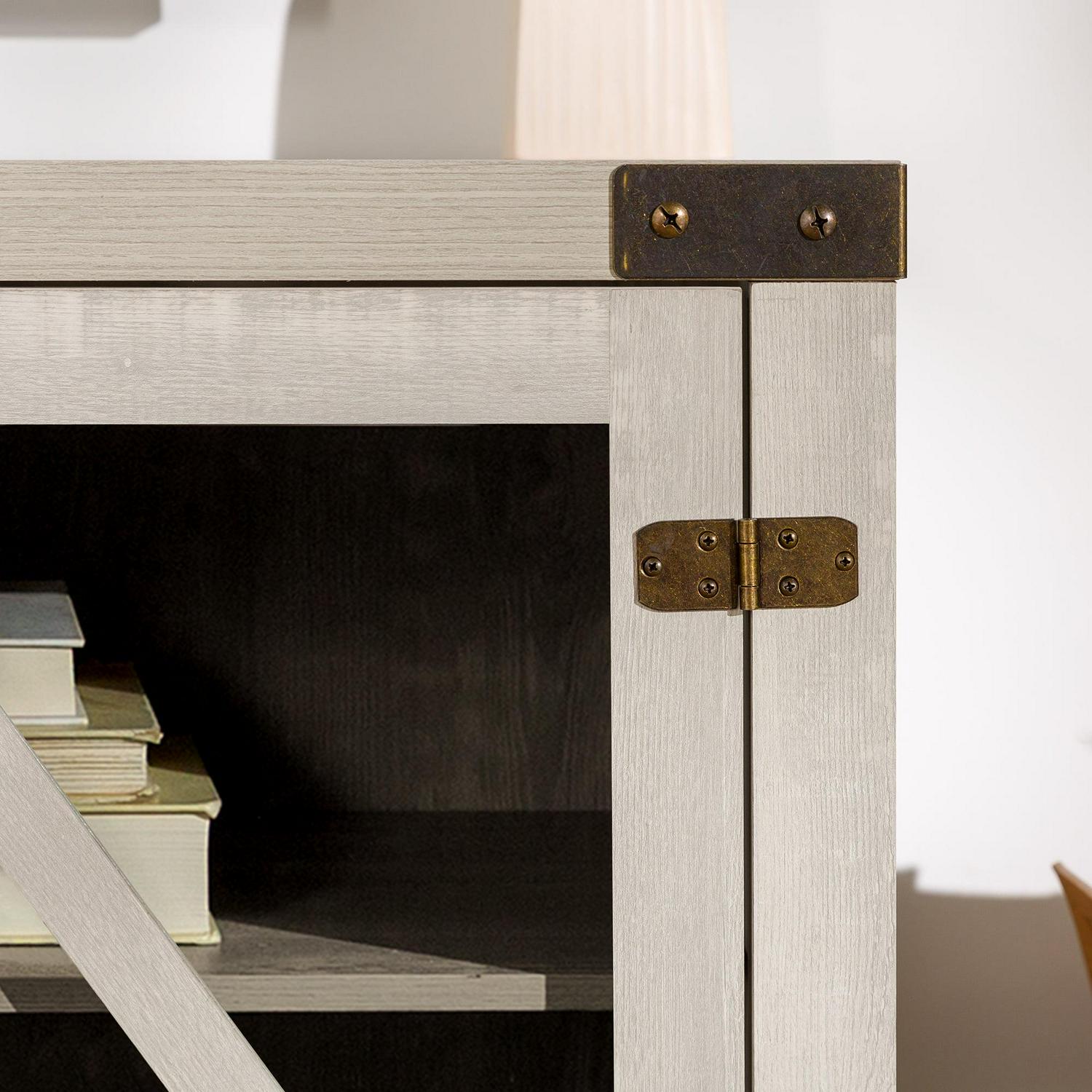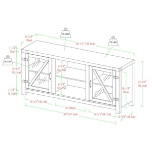 Enhance your living space with the Modern Farmhouse Glass Door TV Stand. This stylish, rustic farmhouse TV stand blends with a modern aesthetic by featuring glass cabinet doors. Metal hinges and corners accent the manufactured wood and laminate construction beautifully. With a versatile design, you can use it as a storage cabinet in your bedroom, buffet in your kitchen, or entertainment center in your living room. Keep your media, books, collectibles, decor, and more on the shelving. It includes adjustable shelving and cord management features in the back to keep your electronics and media organized. Display your TV in style with the Modern Farmhouse Glass Door TV Stand.The collection blends rustic farmhouse style with bohemian accents perfect for any season. This collection makes it easy and affordable to brighten up any room with cozy, vibrant, quality pieces.