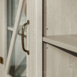 – Sleek glass barn door cabinet fronts for a modern style influence