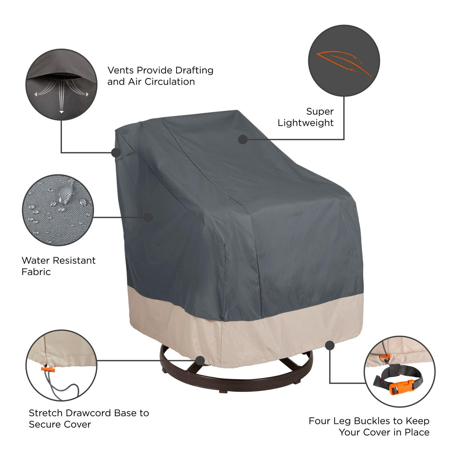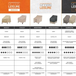 Designed and tested a mile above sea level, Modern Leisure Patio Furniture Covers stand up to the harshest weather elements the Rocky Mountains have to offer. Enhancing your outdoor living space and protecting your investments is a commitment we take very seriously. Spend more time outdoors with loved ones and safeguard your leisure lifestyle. The Renaissance Patio Swivel/Lounge Chair Cover features an attractive, 2-tone aesthetic that is lightweight to maneuver and designed to keep your patio furniture looking its best year-round. Weather-resistant material helps keep outdoor elements at bay while an elastic hem cord provides a fast and custom-like fit. Loaded with features, and a 1-year manufacturer warranty, your outdoor living area will boast beautiful protection with the Renaissance Collection. Take advantage of our warranty program supported by our US-based customer service team and stay protected with Modern Leisure.
