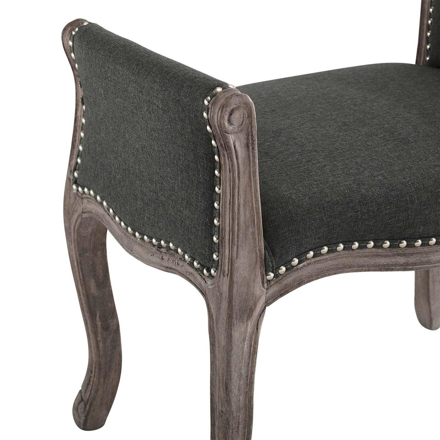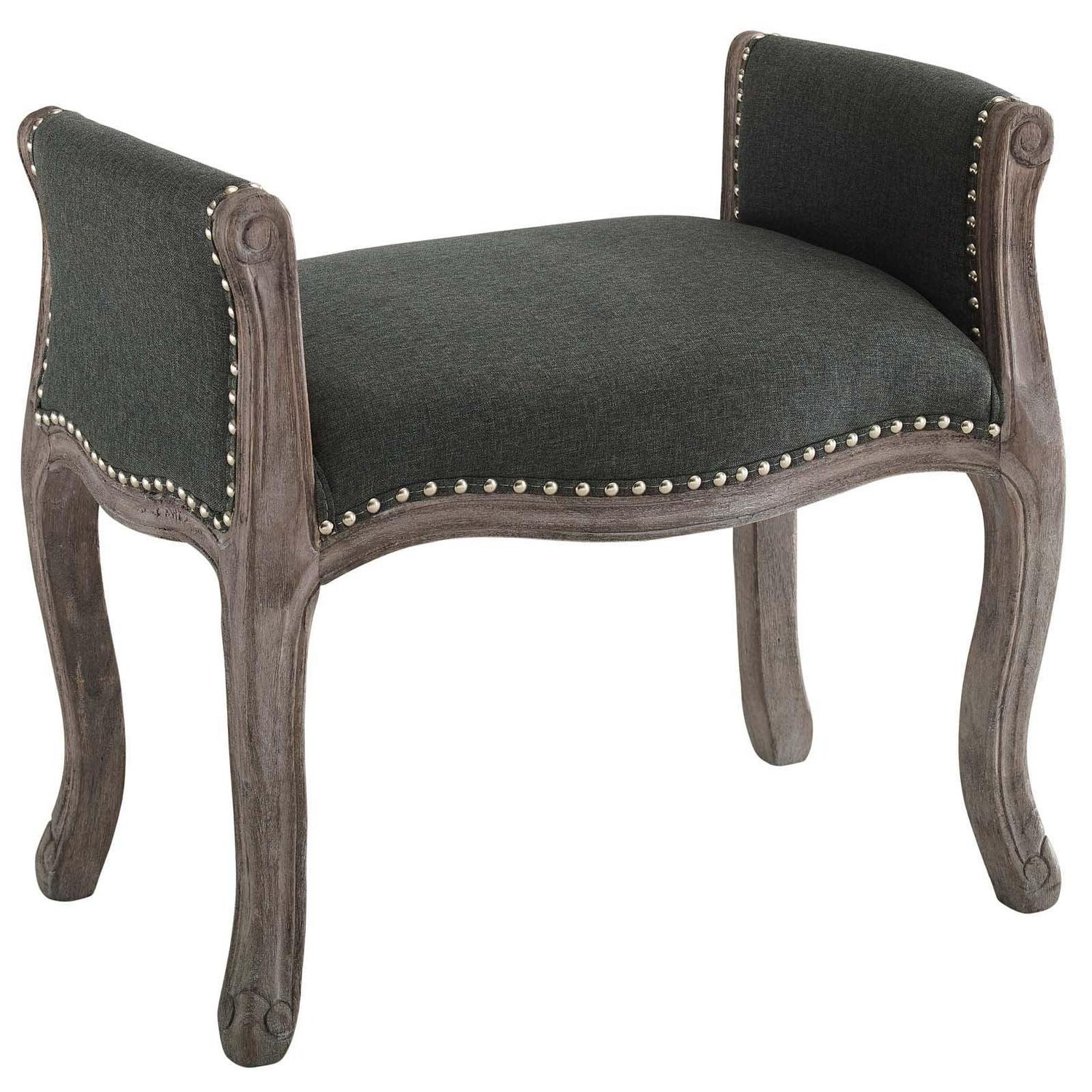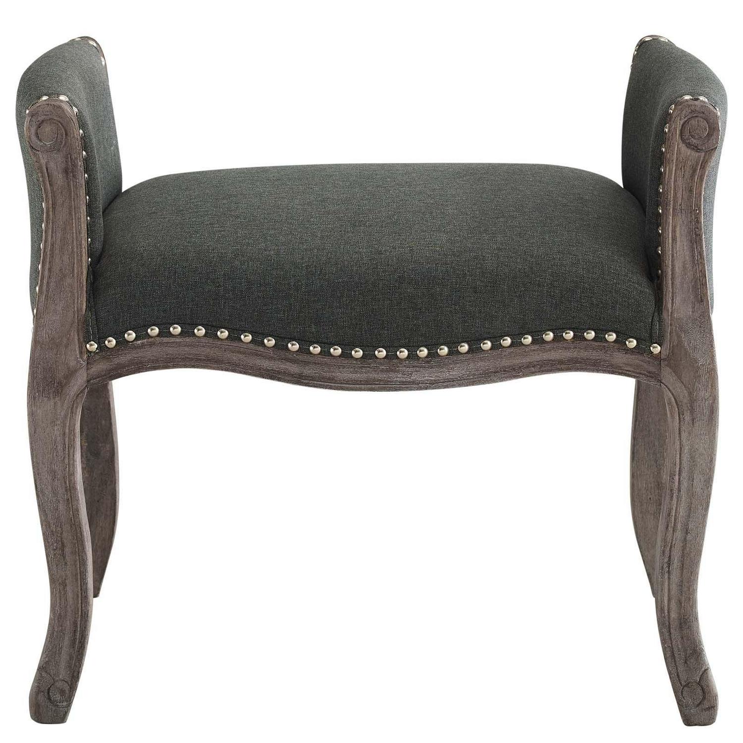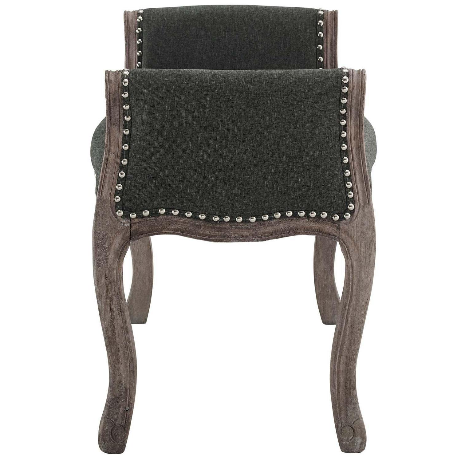 Blending vintage rustic charm with the elegance of French inspiration, the Avail Upholstered Bench is a beautiful addition to your home. Perfect in the bedroom, living room, or entryway foyer, this upholstered bench boasts timeless details that make a chic statement. Featuring nailhead trim, weathered wood cabriole legs, and sophisticated rolled armrests, this modern classic accent bench is upholstered in a soft and durable polyester fabric while dense foam padding creates a comfortable place to sit. Includes foot caps to protect flooring. Bench Weight Capacity: 300 lbs.