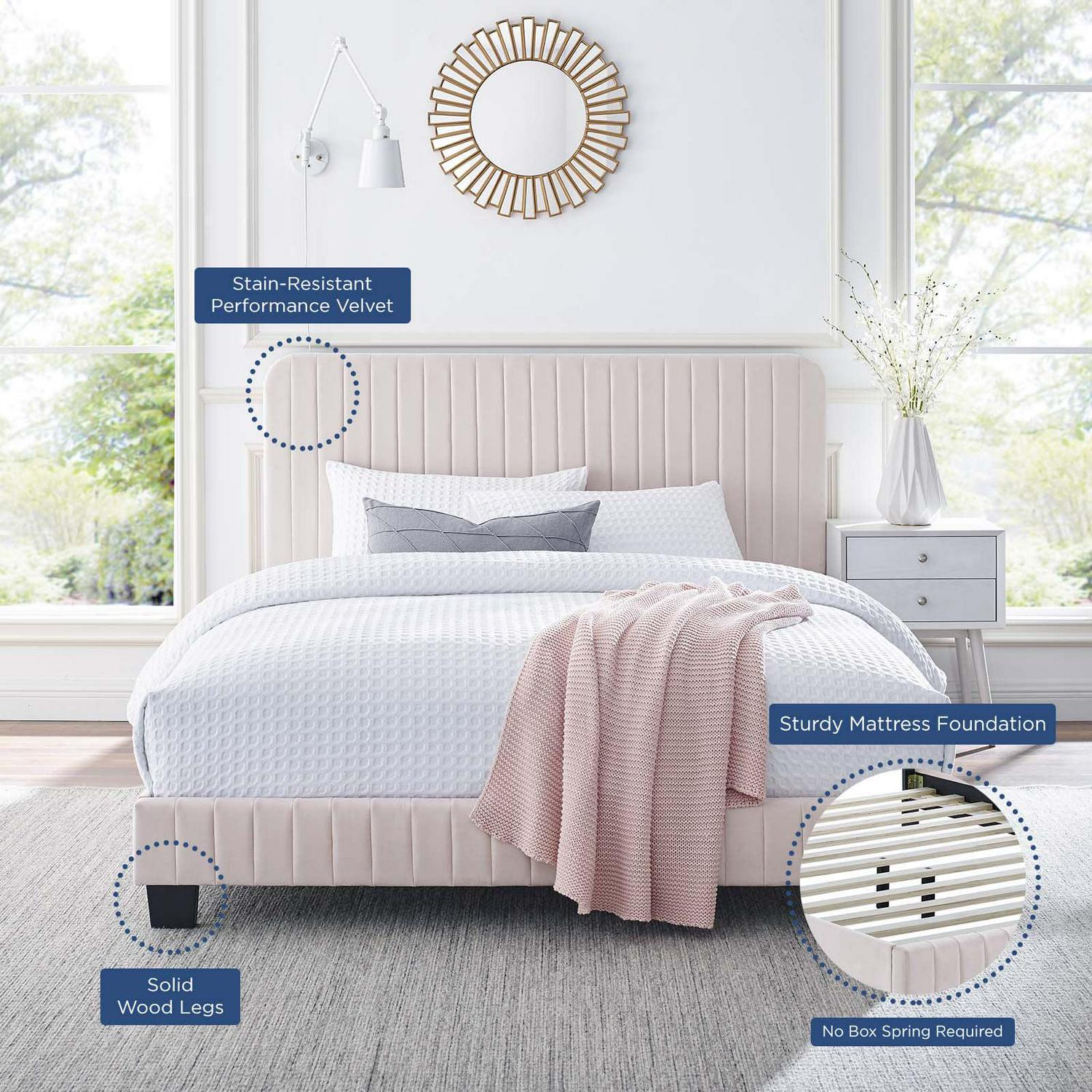 Elevate your master bedroom or guest bedroom style with the luxe texture and glam deco elegance of the Celine Queen Platform Bed. Adorned with channel tufted detail, the queen size headboard of this upholstered bed is padded in dense foam to offer supportive comfort while sitting up resting, relaxing, reading, or watching TV. Upholstered in stain-resistant performance velvet, this platform bed eliminates the need for a box spring with a wood slat support system to allow for ample air circulation and a reinforced center beam and support legs for added durability. A sturdy mattress foundation, this queen size platform bed accommodates a variety of mattress styles including innerspring, memory foam, and latex. Assembly required. Weight Limit: 800 lbs.