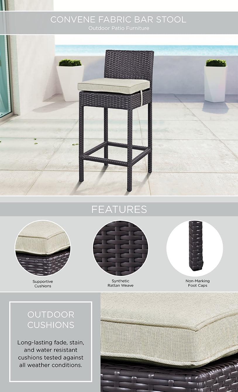 Gather stages of sensitivity with the Convene Outdoor Bar series. Made with a synthetic rattan weave and a powder-coated aluminum frame, Convene Outdoor Bar Stool belongs to a versatile outdoor collection that shifts and combines according to the spontaneous needs of the moment. Outfitted with all-weather fabric cushions, leave a positive impression on friends and family while enhancing your patio, backyard or poolside repast in this series of palpable distinction. This installment of the series is an Outdoor Patio Bar Stool.