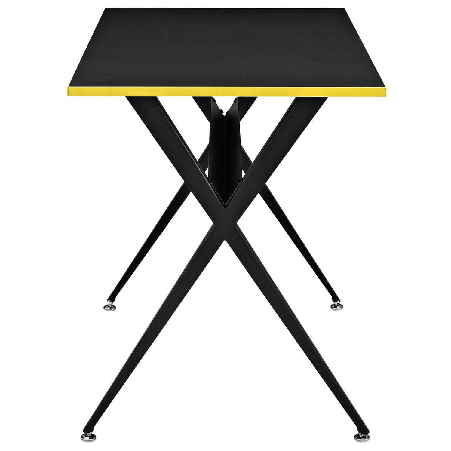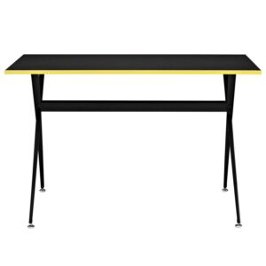 Whether you need a drafting to computer table, simple expressions are the key to motivation. Everything about Expound imparts movement, while the piece remains as simple and sleek as ever. Covered with a smooth melamine top and positioned on powder coated back steel legs, Expound has all you need without demanding all your attention. Expound is easy to setup, even easier to enjoy, and comes with a yellow rim that works wonders when contrasted with the otherwise all black piece.