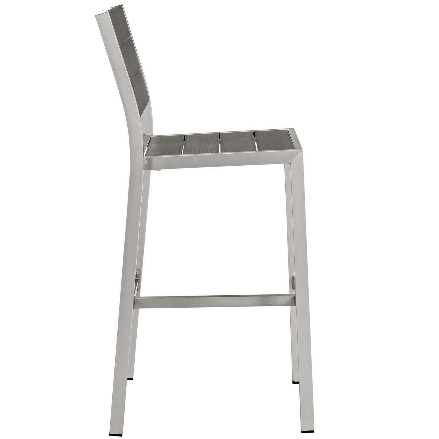 Enjoy your patio or backyard leisure time with the strong and durable Shore Outdoor Patio Armless Bar Stool. Made with an anodized brushed aluminum frame, sturdy footrest, and non-marking black plastic foot caps, Shore Patio Armless Bar Stool features tone-on-tone grays with wood accents on the paneling for a chic and minimalist look. The Shore Outdoor Aluminum Dining Bar Stool complements your casual gatherings with a look and functionality that you can rely on.