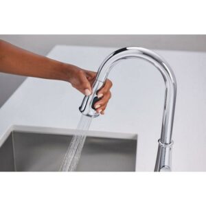 Seamlessly complementing any kitchen design, the Hadley pulldown kitchen faucet offers both graceful Transitional style and helpful functionality. Featuring Moen’s exclusive Power Boost technology, Hadley has a four-function pulldown spray wand with standard stream and spray, as well as boosted stream and spray modes. Kitchen faucets with Power Boost are the first faucets on the market to offer the combined boosted stream and spray innovation. Users simply push the Power Boost button to activate the boosted stream, which fills pots and pitchers faster, while the boosted spray cleans 50 percent faster than Moen faucets without Power Boost technology.
