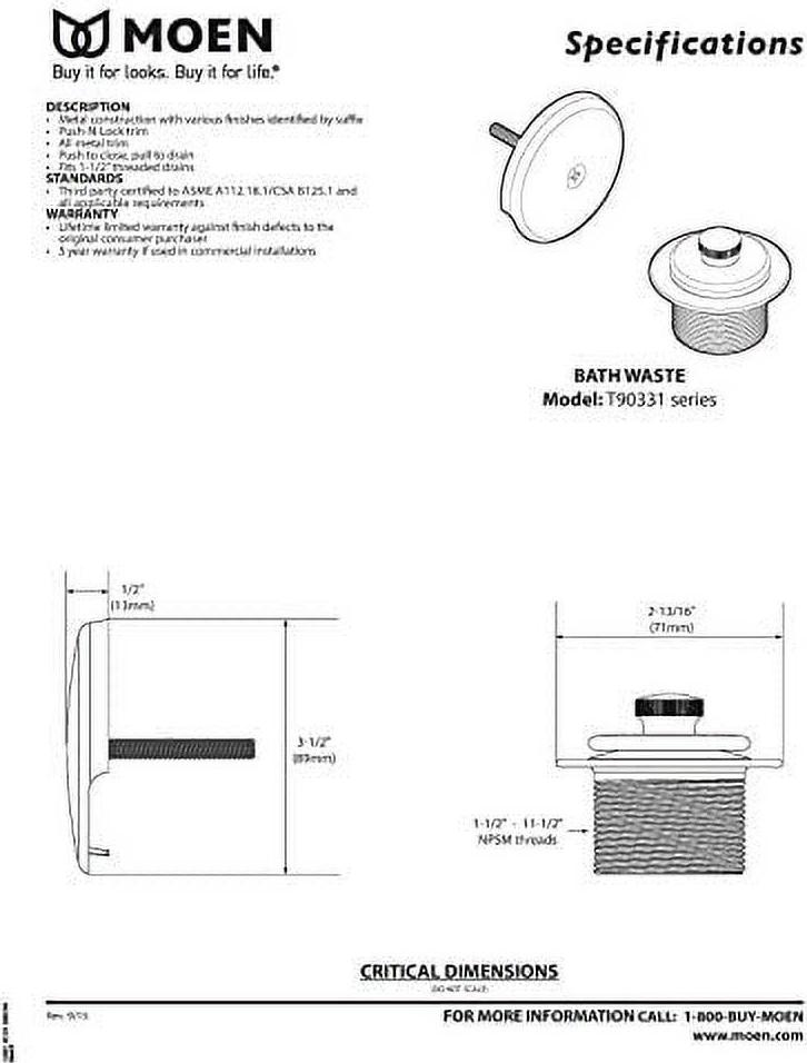 Moen T90331 1-1/2 Threaded Tub Drain Kit – Gold
