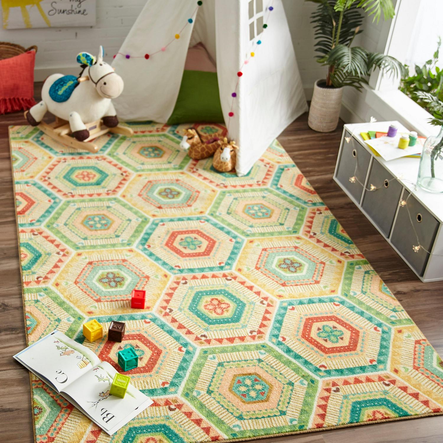 Mohawk Home Prismatic Southwest Geo Multi Contemporary Geometric Kids Precision Printed Area Rug, 5’x8′, Tan and Teal
