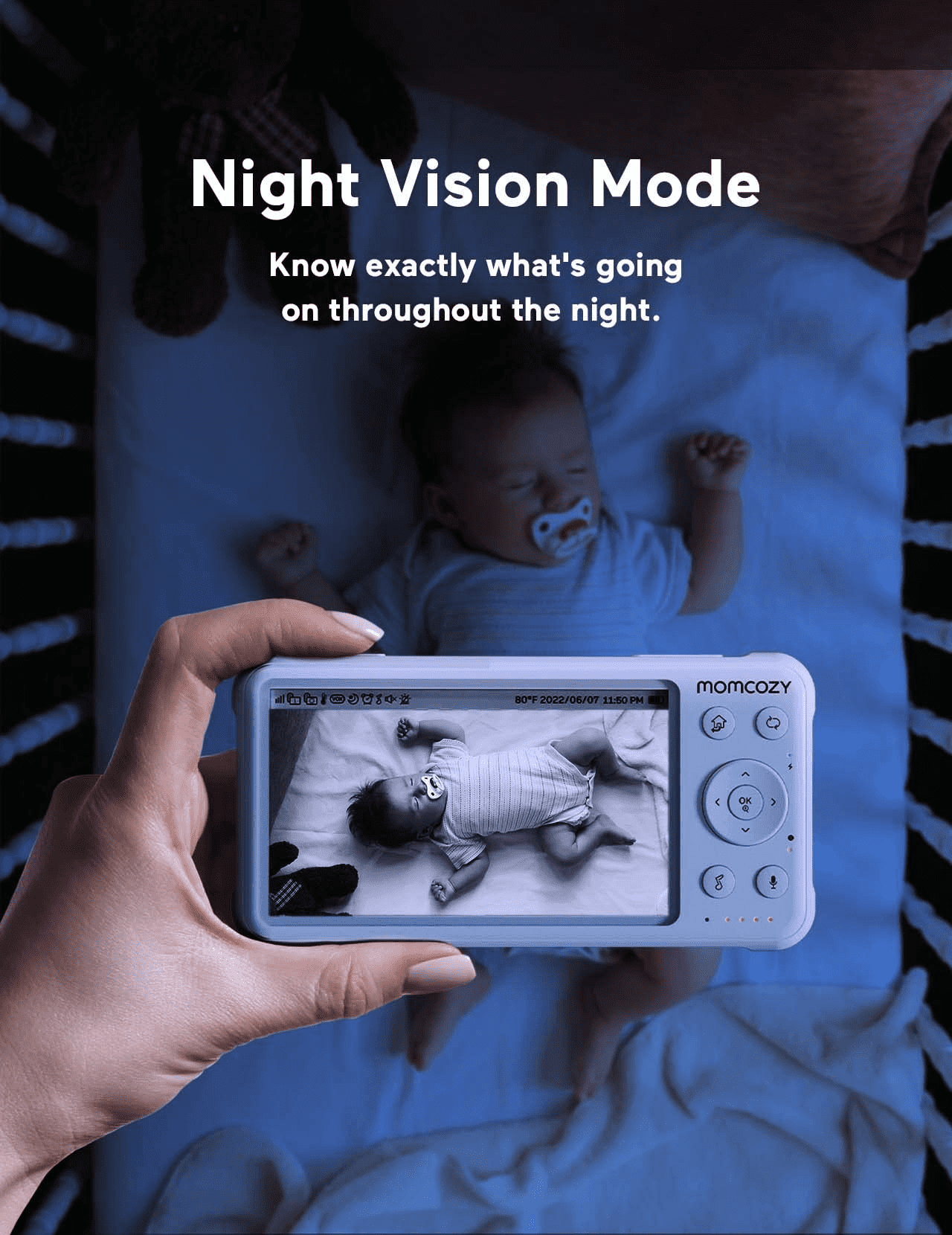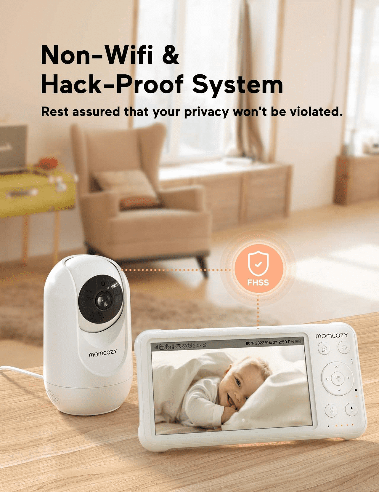 Features: You Deserve Peace not Guesswork: It will always watch out for your baby. Through the 1080p HD camera & 5” large display, you just feel like you are right there. Whether at work, housework, sports, or leisure, you only need to look at the screen for peace of mind Rest Assured throughout the Night: You’ll be able to view clearly with the infrared night vision even if it’s pitch-dark. Even better, it can last all night thanks to the 5000 mAh rechargeable battery. Even with the most frequent checks, the battery life can be as long as 11.5 hours, so you don’t have to worry about missing your baby’s news Never Miss a Single Spot: 360-degree field of view allows a panoramic vision of your little one. You shall never miss a single spot in the room. With its own split-screen and loop playback functions, the monitor will automatically loop between two views, allowing you to fully cover the environment and enjoy a movie-like viewing experience Show up Timely for Your Baby: When your baby gets fussy or lets out a cry, you will hear instantly and the screen will automatically light up when VOX is on. So you can be there when you’re needed. In front of the baby, whether it is playing a lullaby or talking to the baby through the screen, it gives a great sense of security to comfort the baby Easy Setup and Hassle-free Operation: All you need to do is plug in the camera and turn on the monitor to connect instantly, no pairing is required, and it’s ready to use, saving you the hassle of viewing a lot of text. User-friendly Interface: The user interface of the baby monitor is very intuitive and the baby monitor responds very quickly when moving, like there is no waiting. Ideal Gift: The Momcozy Video Baby Monitor is an ideal gift for expecting mothers and new parents to watch over babies, pets, or the elderly Package list: Camera x 1 Baby monitor x 1 Screw x 2 Wall anchor x 2 Wall mount bracket x 1 Power cable x 2 Adapter x 2 User guide x 1