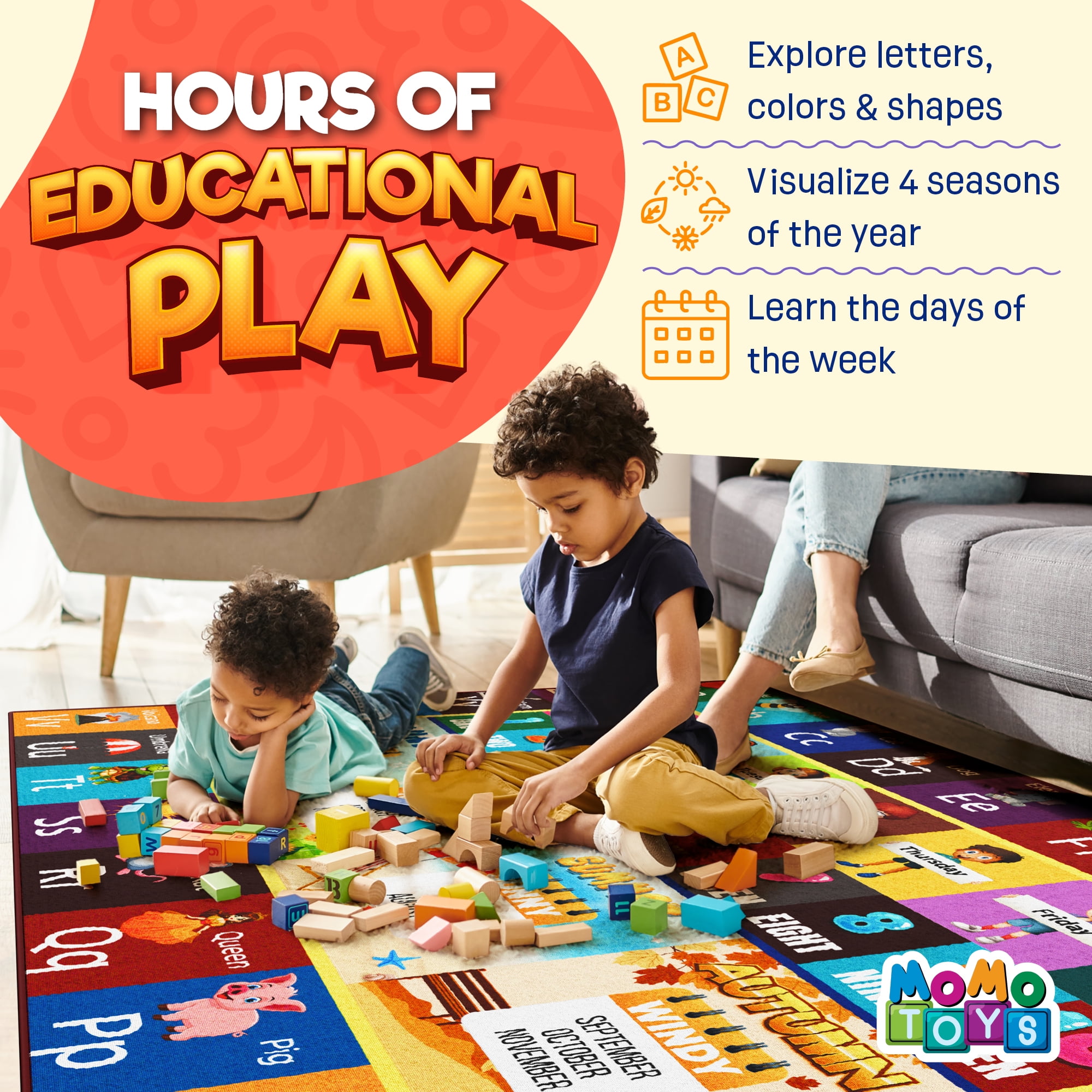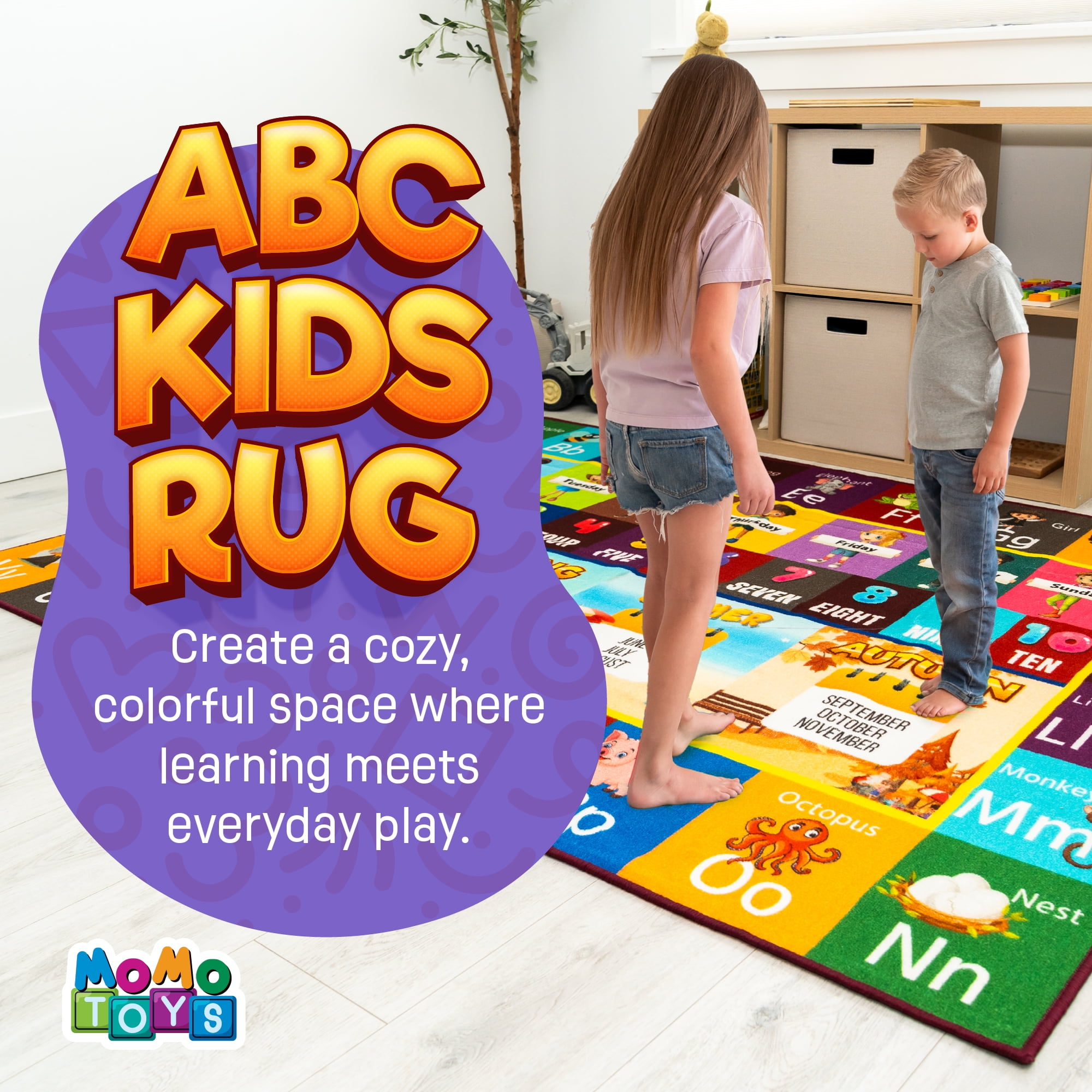 MOMOTOYS Kids Rugs are designed to inspire your child’s imagination and learning. Our plush and durable rugs create a cozy environment where kids can play with their favorite toys comfortably. Vibrant colors and engaging designs make these rugs a delightful addition to any playroom or bedroom. The educational aspect shines through with ABC letters paired with adorable animals, numbers, days of the week, and seasonal motifs, making learning fun and interactive. These versatile rugs are perfect for various spaces like playrooms, bedrooms, or school classrooms, offering both comfort and educational value. They are hand-washable, ensuring easy maintenance without compromising on color quality. As a bonus, each rug includes a complimentary coloring book, encouraging creativity and further learning opportunities. Whether used as a carpet for kids play areas or as an educational tool in schools, MOMOTOYS Kids Rugs are crafted to stimulate young minds and enhance their learning experiences through play.