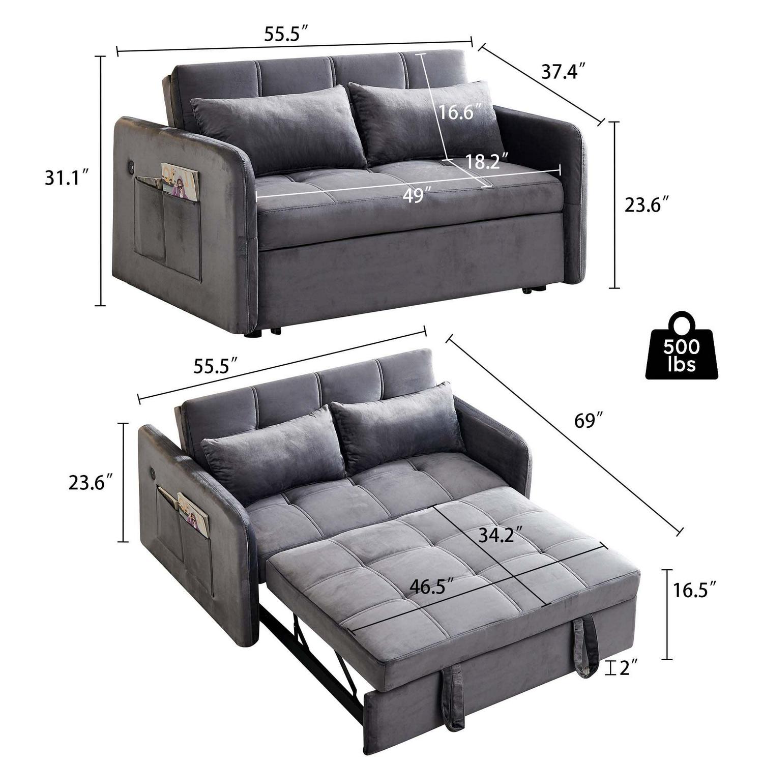 – DIMENSION- Weight limit 500 pounds, sofa overall dimension 55.5″ W x 37.4″ D x 31.1″ H, sofa bed overall dimension 55.5″ W x 69″ D x 23.6″ H. To save your time and get suitable items, please kindly check the dimension whether they are expected.
