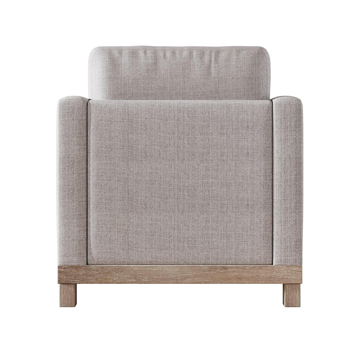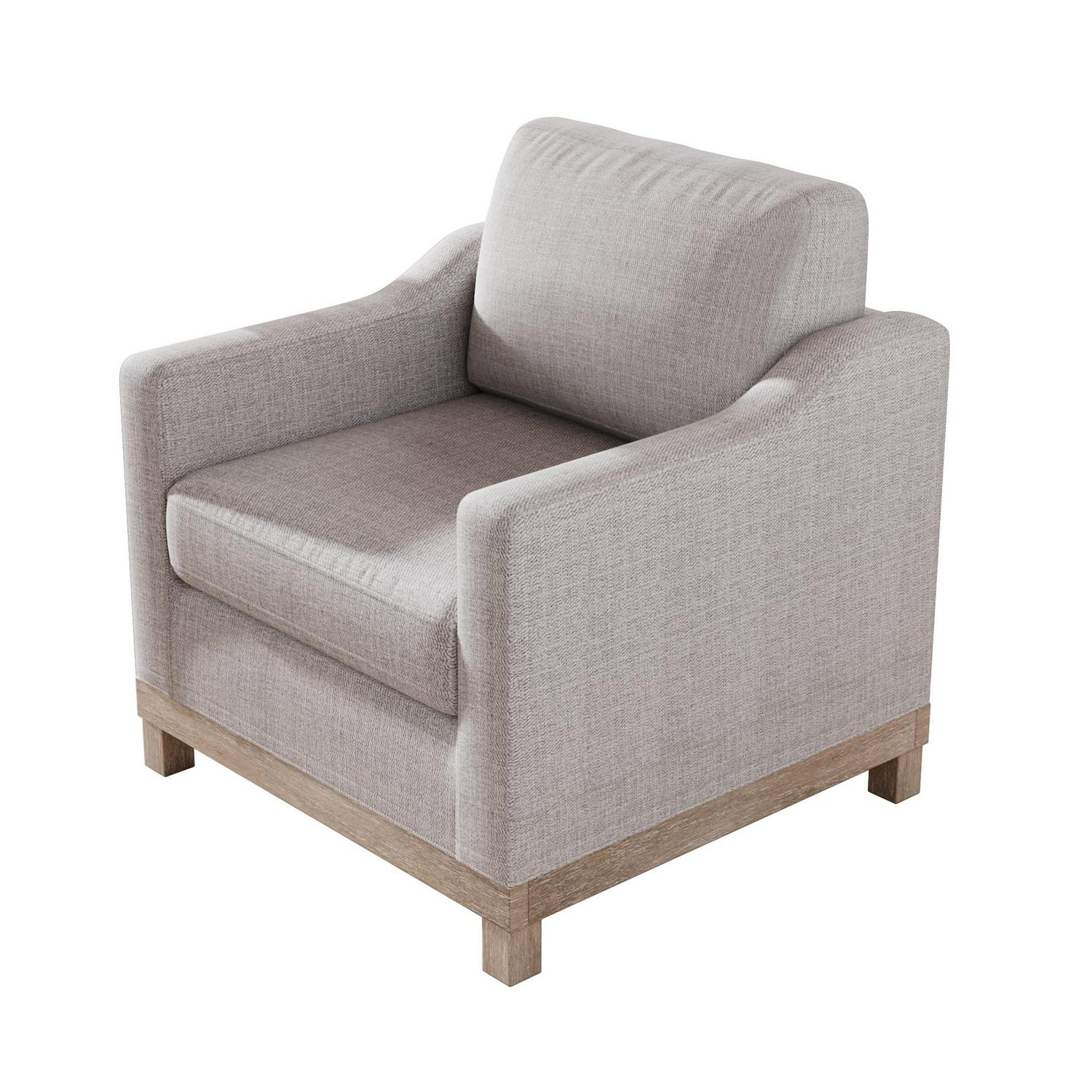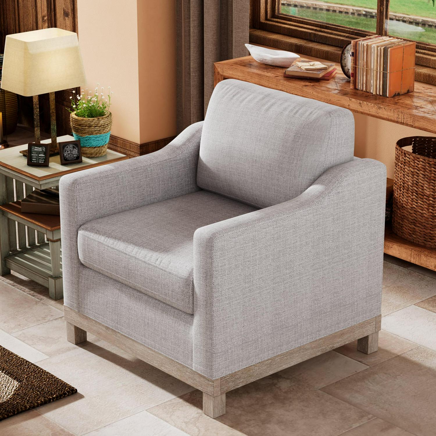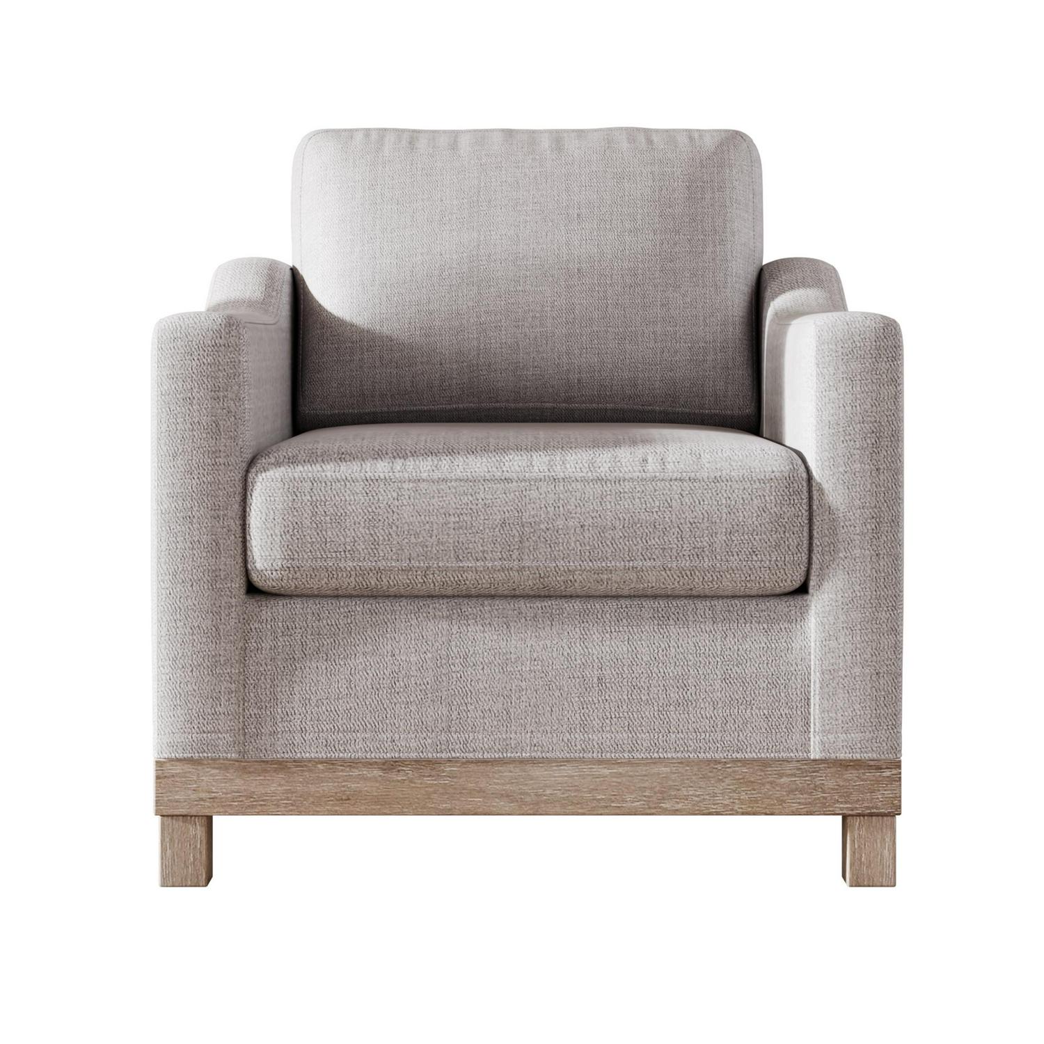 Pillow-like seating and clean lines make this armchair the ultimate cozy, yet stylish accent piece. This MSP-LVC1-109 seat rests on a streamlined base with four solid wood legs made from rubber wood. Contrasting the sleek, modern frame is polyester blend upholstery, which is offered in your choice of neutral hue. For added coziness, this chair boasts foam-filled seat and back cushions with web suspension for added support. Simple, timeless, and modern, this armchair has a versatile look that’s made to outlast changing seasons and changing trends.