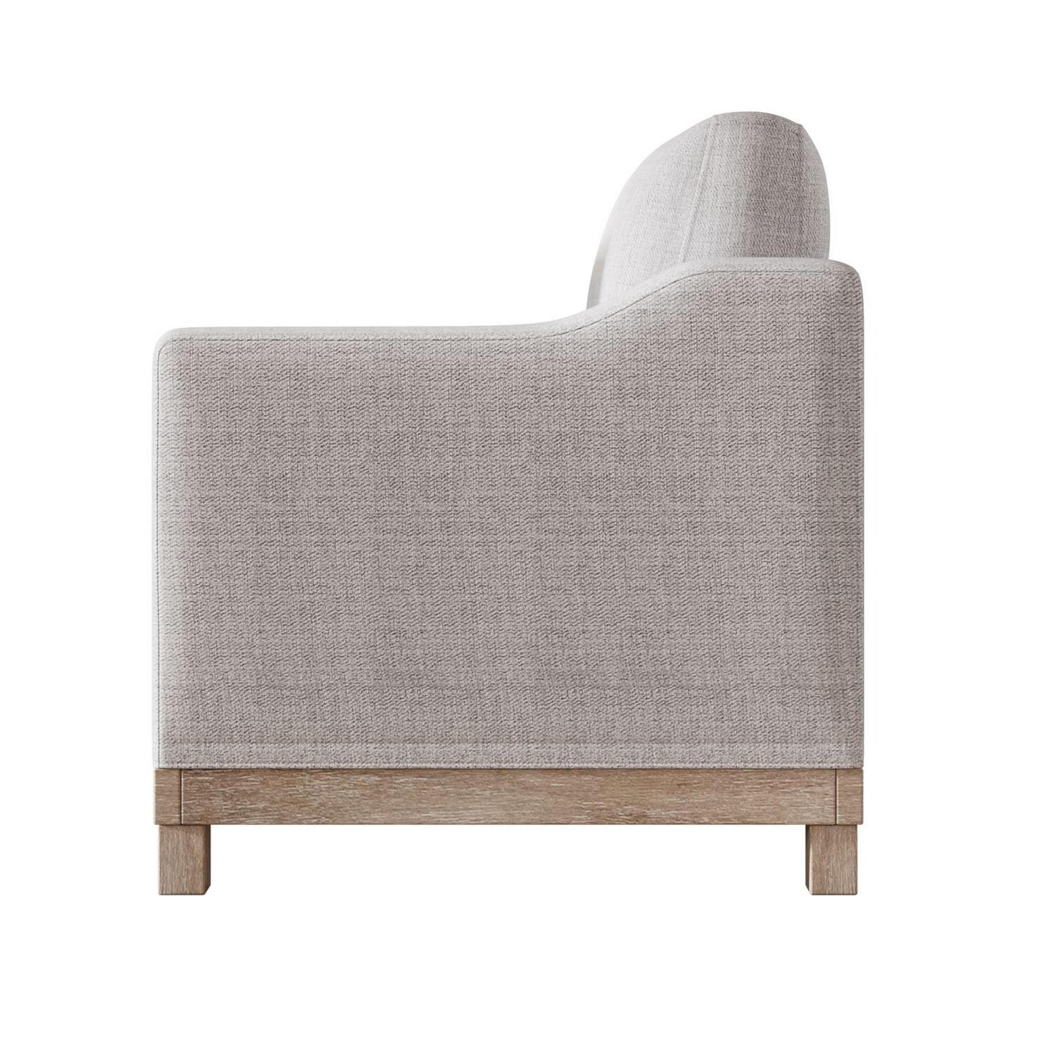 STRONG CONSTRUCTION – Solid rubber wood exposed frame with natural variation. Kiln-dried wood helps prevent warping, splitting, cracking and developing mildew. A solid wood frame, base and legs provide strong structure softened by plush foam padding and neutral-hued upholstery.